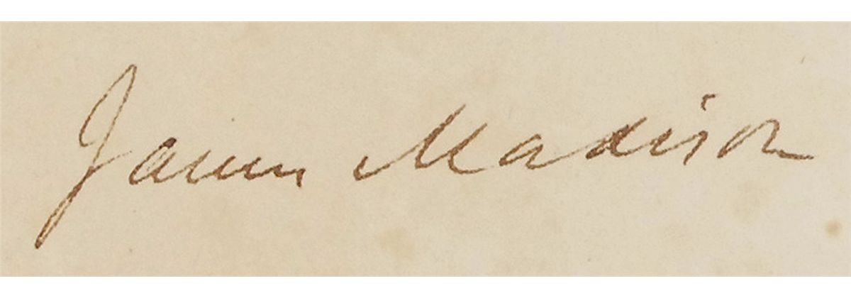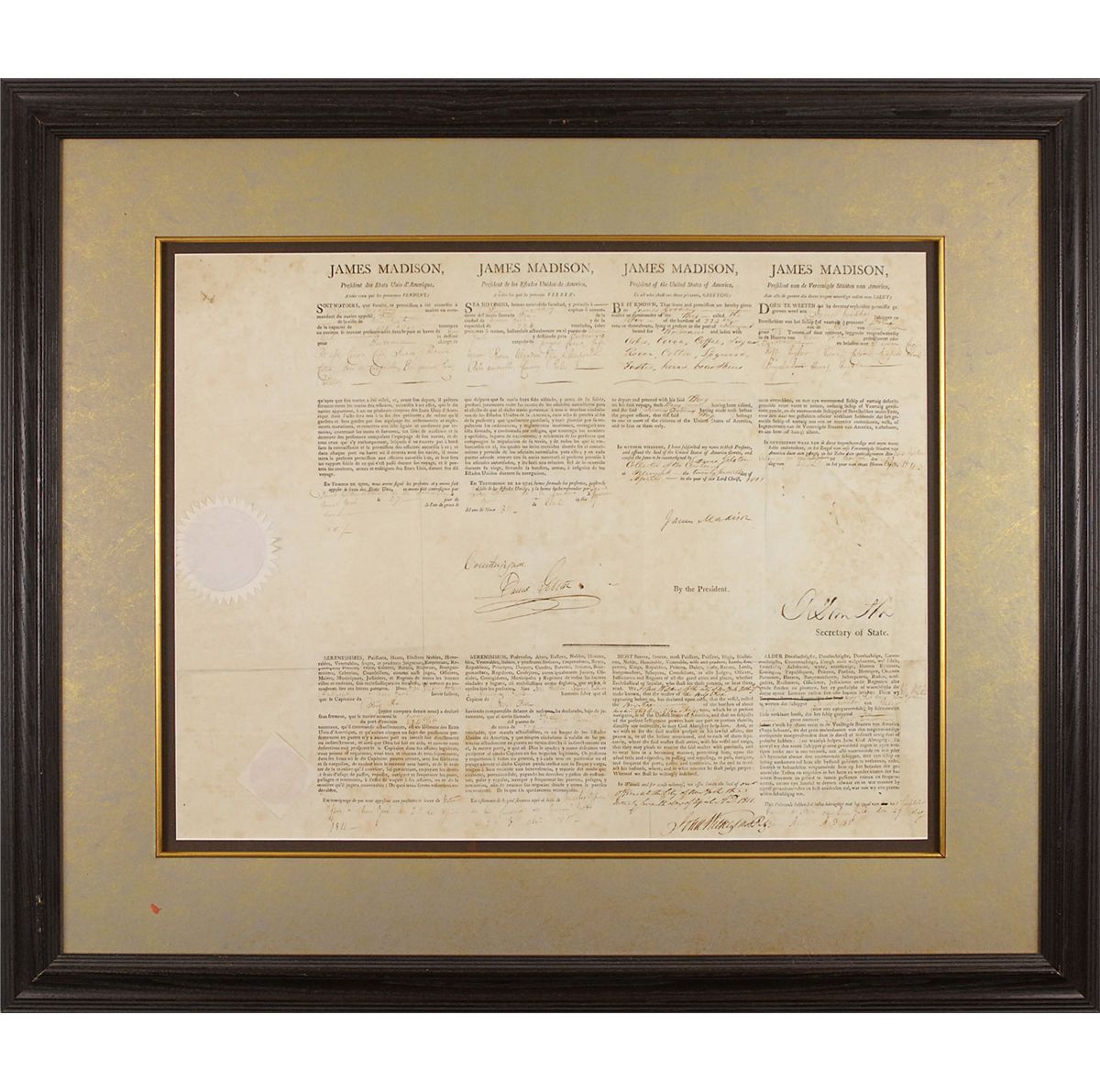 Partly-printed DS as president, one page, 20.5 x 16, April 27, 1811. Four-language ship’s papers issued to James Goodday, “master or commander of the Brig called The Fox…lying at present in the port of New York bound for Bordeaux,” laden with a wide array of goods including “cocoa, coffee, sugar, rocoa, cotton, logwood, horns, and bear skins.” Signed at the conclusion by Madison and countersigned by Secretary of State Robert Smith. White seals affixed to left side remain fully intact. Attractively double-matted and framed to an overall size of 30.5 x 26. Intersecting folds, light overall foxing, and a tiny hole to the upper left, otherwise fine condition. Oversized.