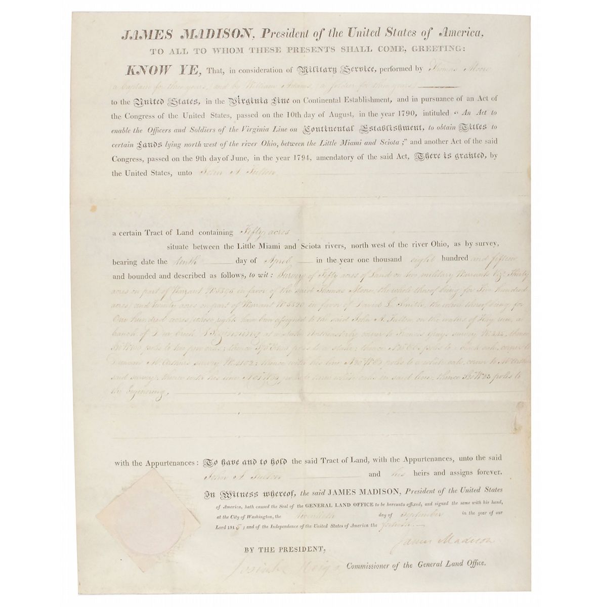 Partly-printed vellum DS as president, one page, 12 x 15, September 20, 1815. President Madison grants 50 acres of land to, “Thomas Moore, a Captain for three years, and by William Adams, a soldier for three years, to the United States, in the Virginia Line on Continental Establishment, and in pursuance of an Act of the Congress of the United States passed on the 10th day of August, in the year 1790, intituled ‘An Act to enable the Officers and Soldiers of the Virginia Line on Continental Establishment, to obtain Titles to certain Lands lying north west of the river Ohio, between the Little Miami and Sciota;’” In fine condition, with intersecting folds, curled edges from previous rolling, and a few words of handwritten text just a shade light. The white paper seal is intact.