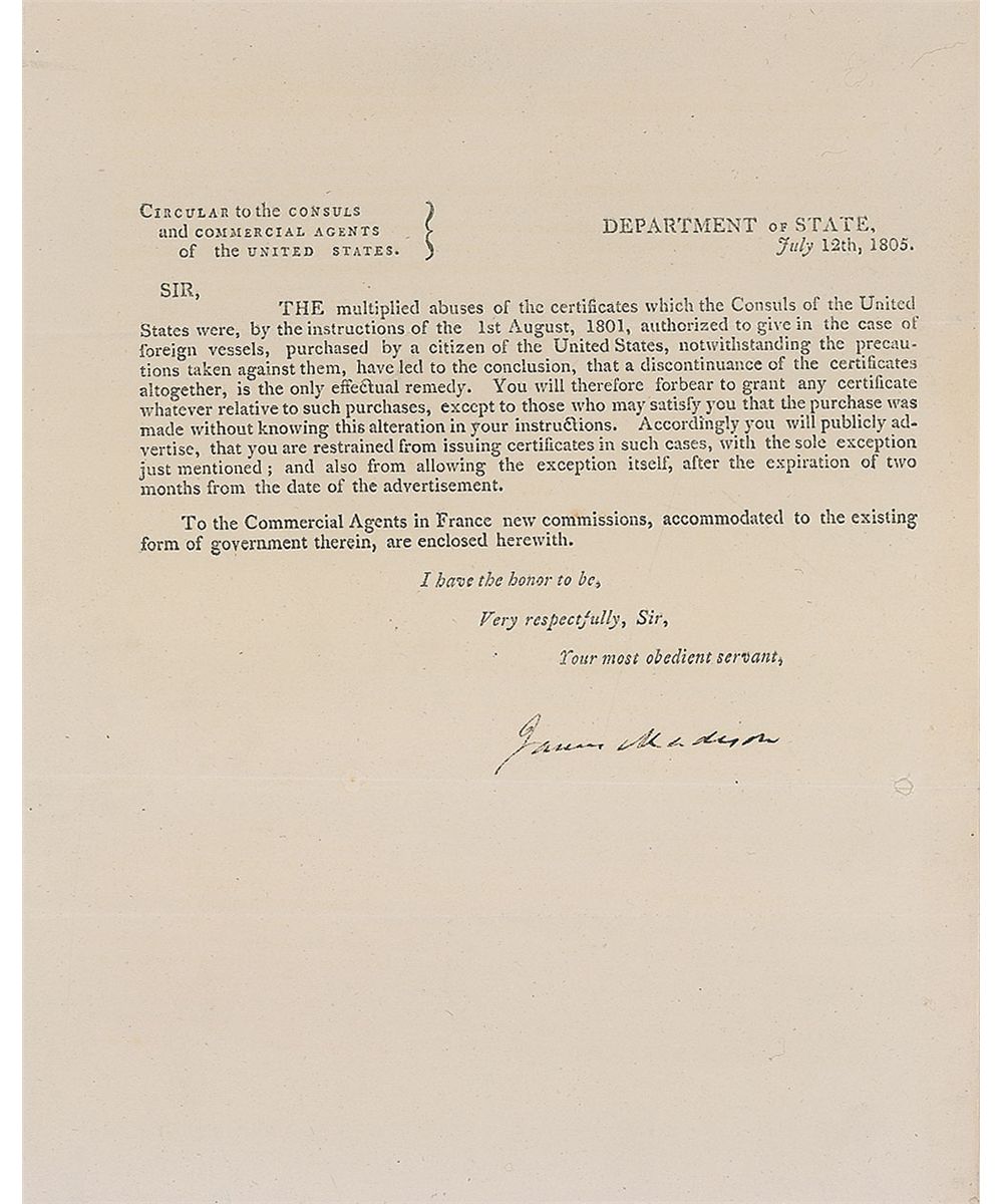 Printed DS, one page, 8 x 10, July 12, 1805. Department of State circular to the consuls and commercial agents of the United States. In part: “The multiplied abuses of the certificates which the Consuls of the United States were, by the instructions of the 1st August, 1801, authorized to give in the case of foreign vessels, purchased by a citizen of the United States, notwithstanding the precautions taken against them, have led to the conclusion, that a discontinuance of the certificates altogether, is the only effectual remedy. You will therefore forbear to grant any certificates whatever relative to such purchases, except to those who may satisfy you that the purchase was made without knowing this alteration in your instructions. Accordingly you will publicly advertise, that you are restrained from issuing certificates in such cases, with the sole exception just mentioned.” In fine condition, with three unobtrusive mailing folds and a small puncture to the right border. This circular relates to the consular ability to issue certificates confirming ownership of ships purchased abroad, allowing them to return to specific ports in the United States. A choice document with interesting content.