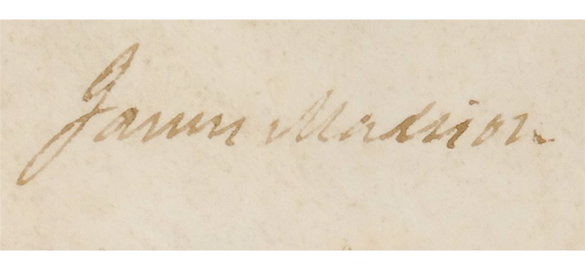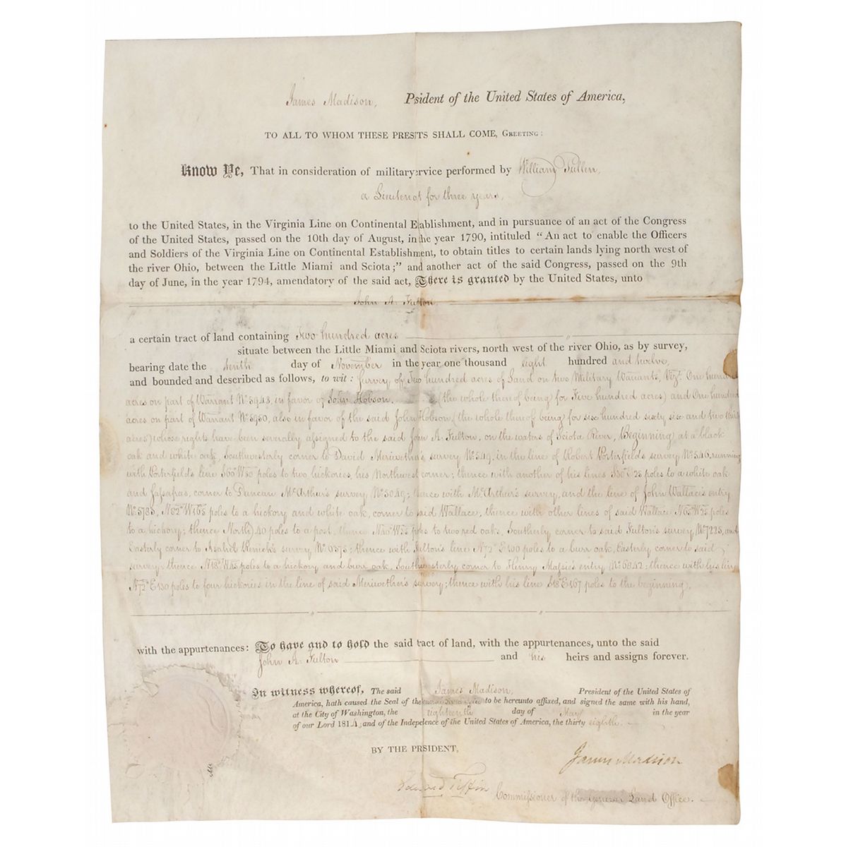 Partly-printed vellum DS as president, one page, 12 x 15, May 18, 1848. President Madison grants “William Pullen, a Lieutenant for three years, to the United States, in the Virginia Line on Continental Establishment…a certain tract of land containing Two hundred acres, situate between the Little Miami and Sciota rivers, north west of the river Ohio.” Boldly signed at the conclusion by Madison and countersigned by Edward Tiffin. Retains the white paper seal affixed to lower left, with loss of a few points. Heavy intersecting storage folds and some staining to edges, otherwise fine condition.
