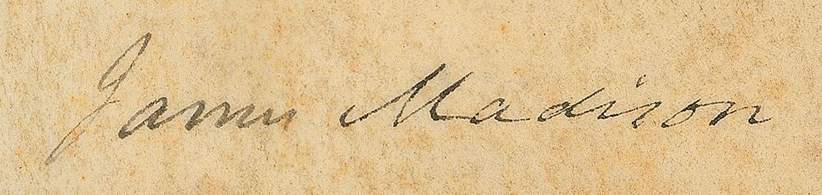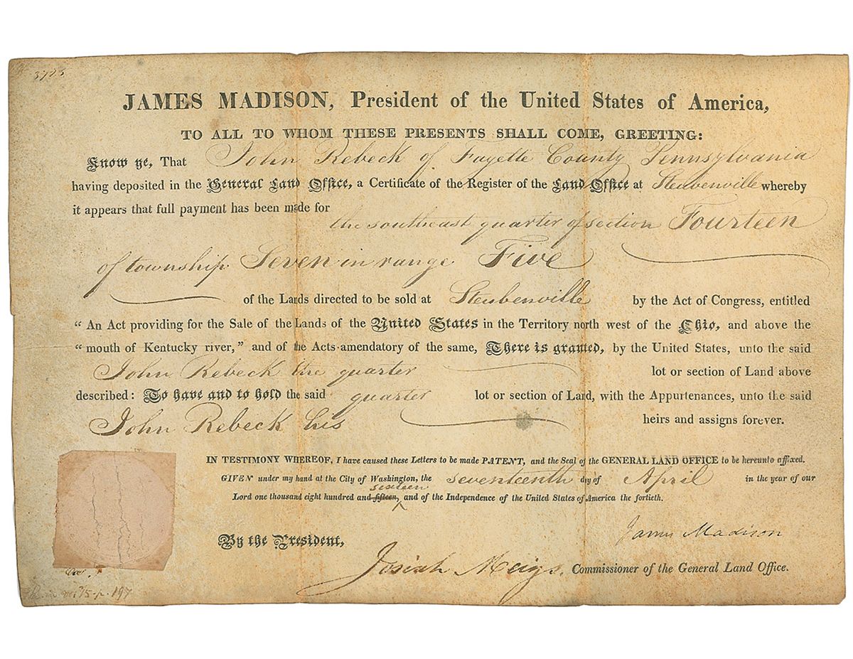 Partly-printed vellum DS as president, one page, 13 x 8.75, April 17, 1816. President Madison grants John Rebeck of Fayette County, Pennsylvania, a parcel of land in “the southeast quarter of section Fourteen of township Seven in range Five of the Lands directed to be sold at Steubenville.” Crisply signed at the conclusion by President Madison and countersigned by Commissioner of the General Land Office Josiah Meigs. The white paper seal affixed to lower left remains intact. Two noticeable vertical storage folds and overall foxing and soiling, otherwise fine condition; all writing and both signatures remain quite bold and eminently legible.