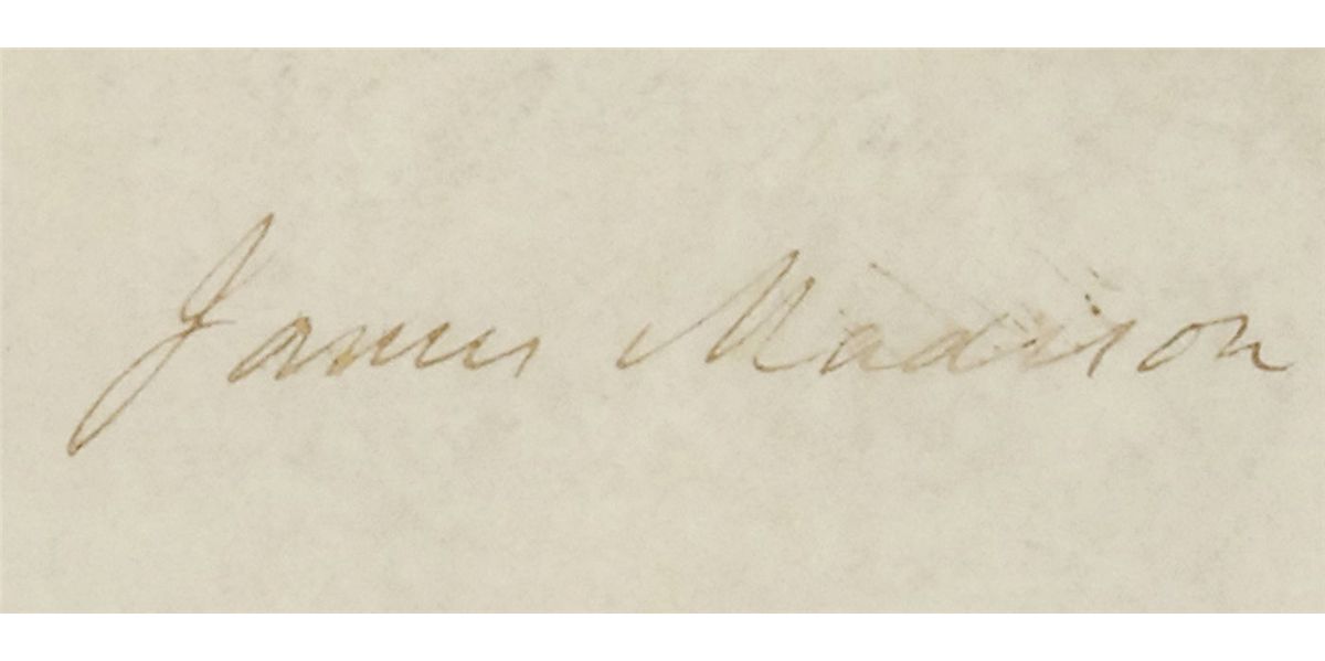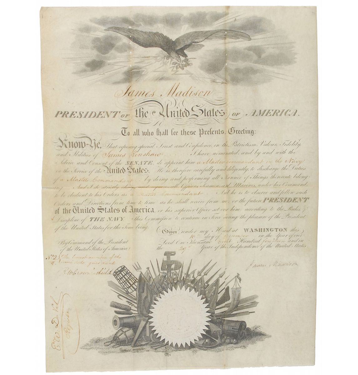 War-dated partly-printed vellum DS as president, one page, 13 x 17.25, December 10, 1814. President Madison appoints James Renshaw as “a Master Commandant in the Navy in the Service of the United States.” Crisply signed at the conclusion by Madison. The white paper seal affixed at the bottom in the center of the intricate vignette remains crisp and fully intact. Intersecting folds, a split to the left edge, and a few small holes along the upper folds, otherwise fine condition.