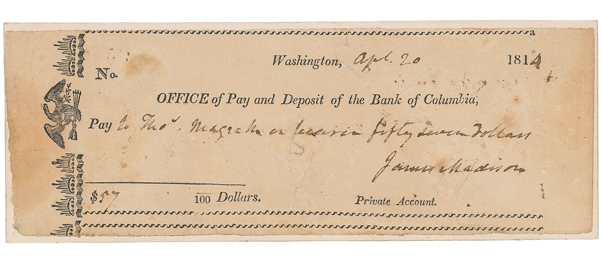 Scarce war-dated Bank of Columbia check, 7.5 x 2.5, filled out and signed by Madison as president, payable to Thos. Magrath or bearer for $57, April 20, 1814. Affixed to a slightly larger mount. Expected cancellation cuts (two passing through the first letters of his last name) and light scattered stains, otherwise fine condition. Madison wrote this check as the War of 1812 raged on, reaching a domestic crescendo just four months later when the British invaded Washington and burned the White House and Capitol.