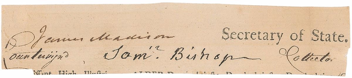 Ink signature as secretary of state, “James Madison,” on an off-white 5.5 x .75 slip clipped from a document. Countersigned by Samuel Bishop as collector. In fine condition, with slight surface loss to edges. Madison served as secretary of state under Thomas Jefferson from 1801 to 1809.