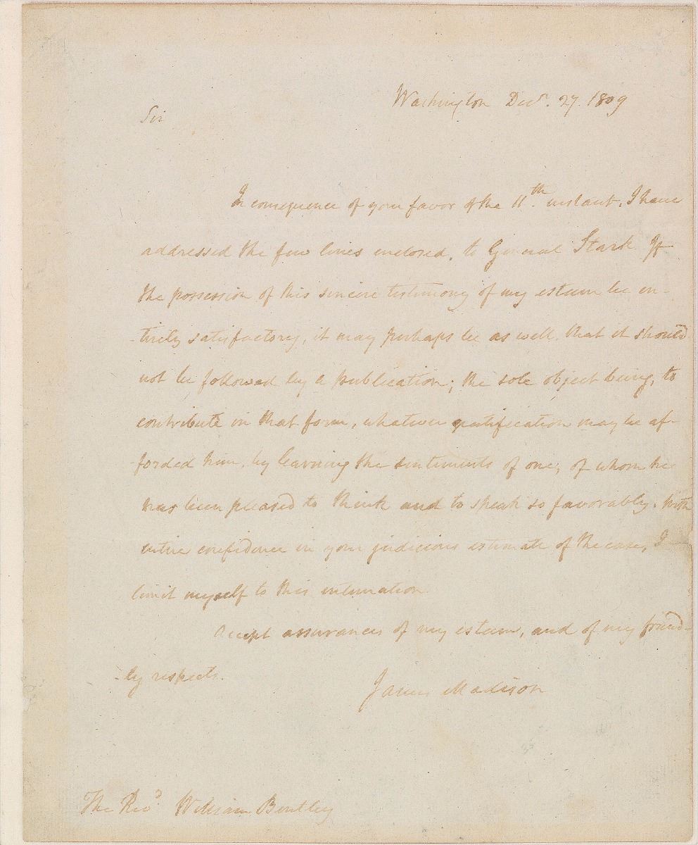 ALS as president, one page, 7.75 x 9.75, December 27, 1809. Letter to Reverend William Bentley regarding a testimonial for General John Stark. In part: “I have addressed the few lines enclosed to General Stark. If the possession of this sincere testimony of my esteem be entirely satisfactory, it may perhaps be as well that it should not be followed by a publication; the sole object being, to contribute in that form, whatever gratification may be afforded to him, by bearing the sentiments of one, of whom he has been pleased to think and to speak so favorably. With entire confidence in your judicious estimate of the case, I limit myself to this intimation.” Professionally cleaned and silked on both sides; in fine condition, with writing a couple shades light.