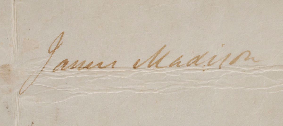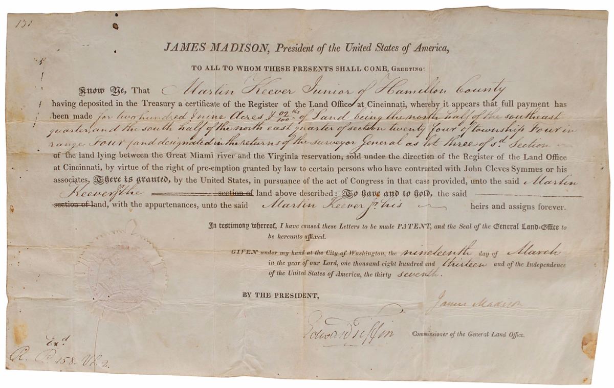 Partly-printed vellum DS as president, one page, 14.75 x 9, March 19, 1813. Land grant issued to Martin Keever Junior stating that “full payment has been made for two hundred & nine acres…of the land lying between the Great Miami River and the Virginia reservation.” Signed at the conclusion by President Madison, and countersigned by Commissioner of the General Land Office Edward Tiffin. The crisp white paper seal affixed to the lower left remains fully intact. Reverse bears a Warren County records stamp, dated October 3, 1923. In fine condition.