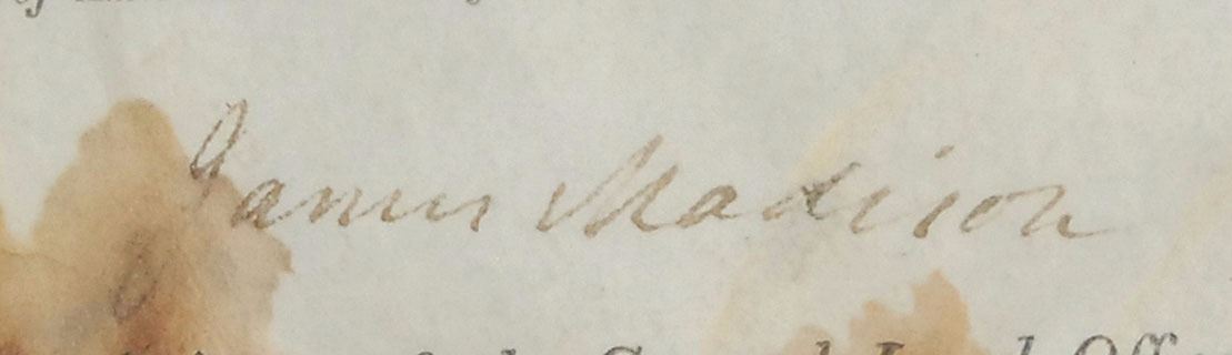 Partly-printed DS as president, one page, 12.5 x 8.25, April 18, 1815. Land grant issued to Franz Germand for a quarter lot of land under “'An act providing for the sale of the Lands of the United States in the Territory north-west of the Ohio, and above the mouth of the Kentucky River.'” Signed at the conclusion by Madison and countersigned by Josiah Meigs as commissioner of the General Land Office. The white paper seal affixed to lower left is intact and lightly toned. Framed and in very good condition, with overall wrinkling, and staining to edges touching the first two letters of the signature.