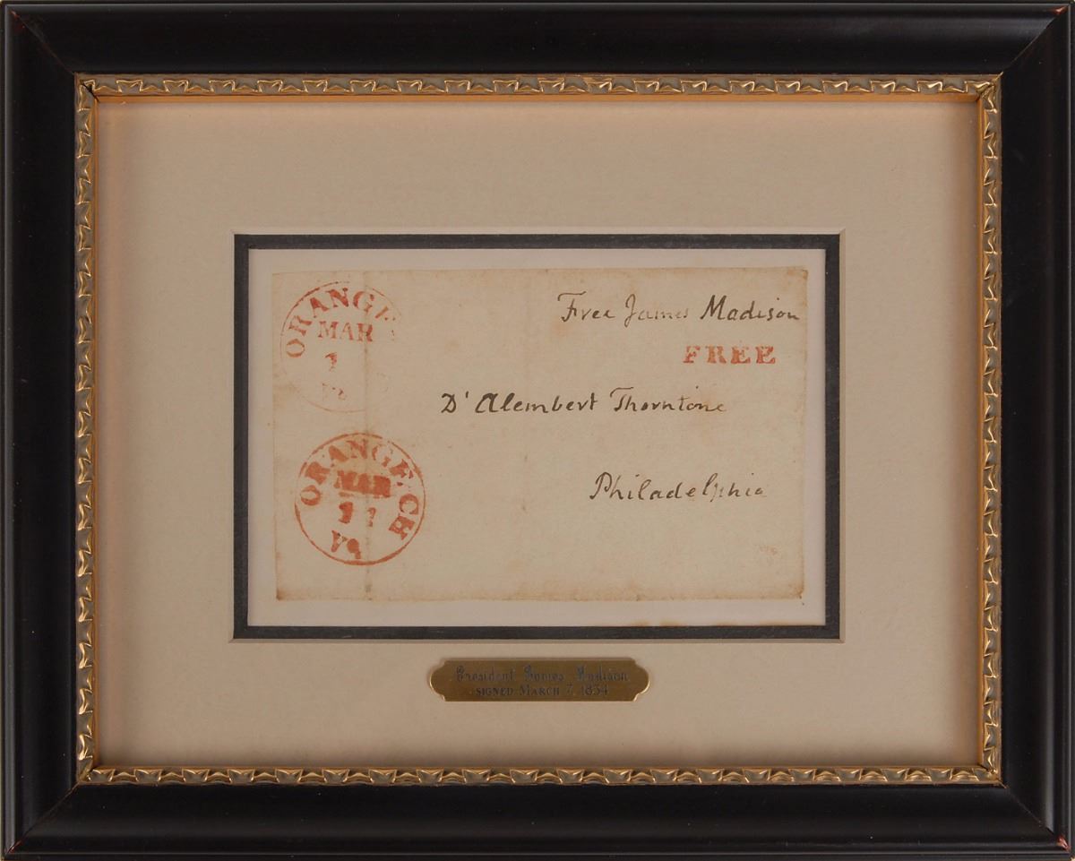 Free frank panel, 4.75 x 3, addressed in Madison's hand to "D'Alembert Thornton, Philadelphia," and franked in the upper right, "Free, James Madison." Panel bears a "Free" ink stamp and two postmarks. Mounted, double-matted, and framed to an overall size of 9.75 x 7.75, with a small plaque dating it to March 7, 1834. In fine condition.