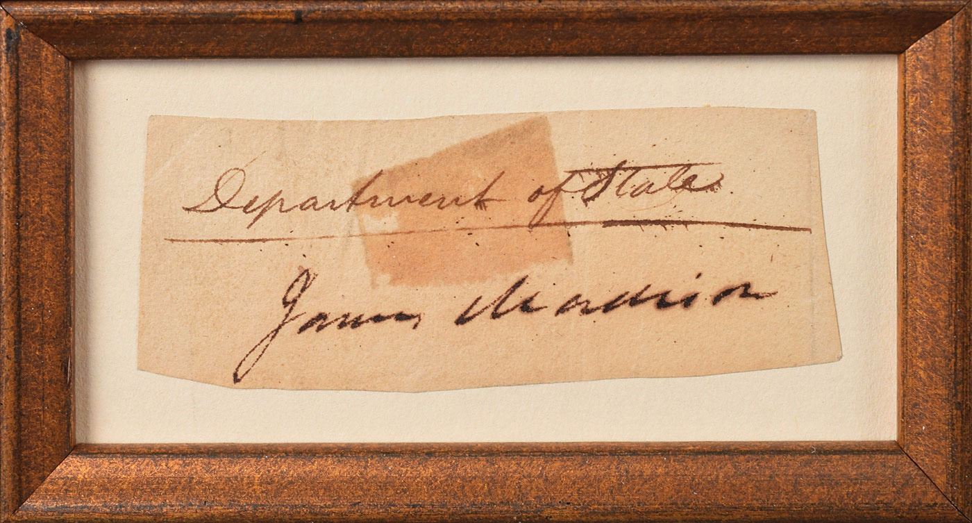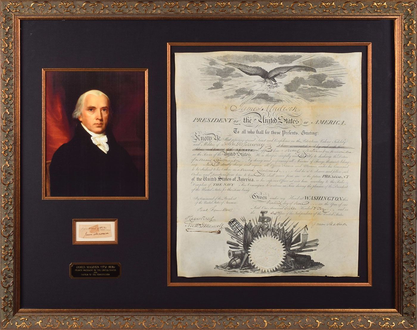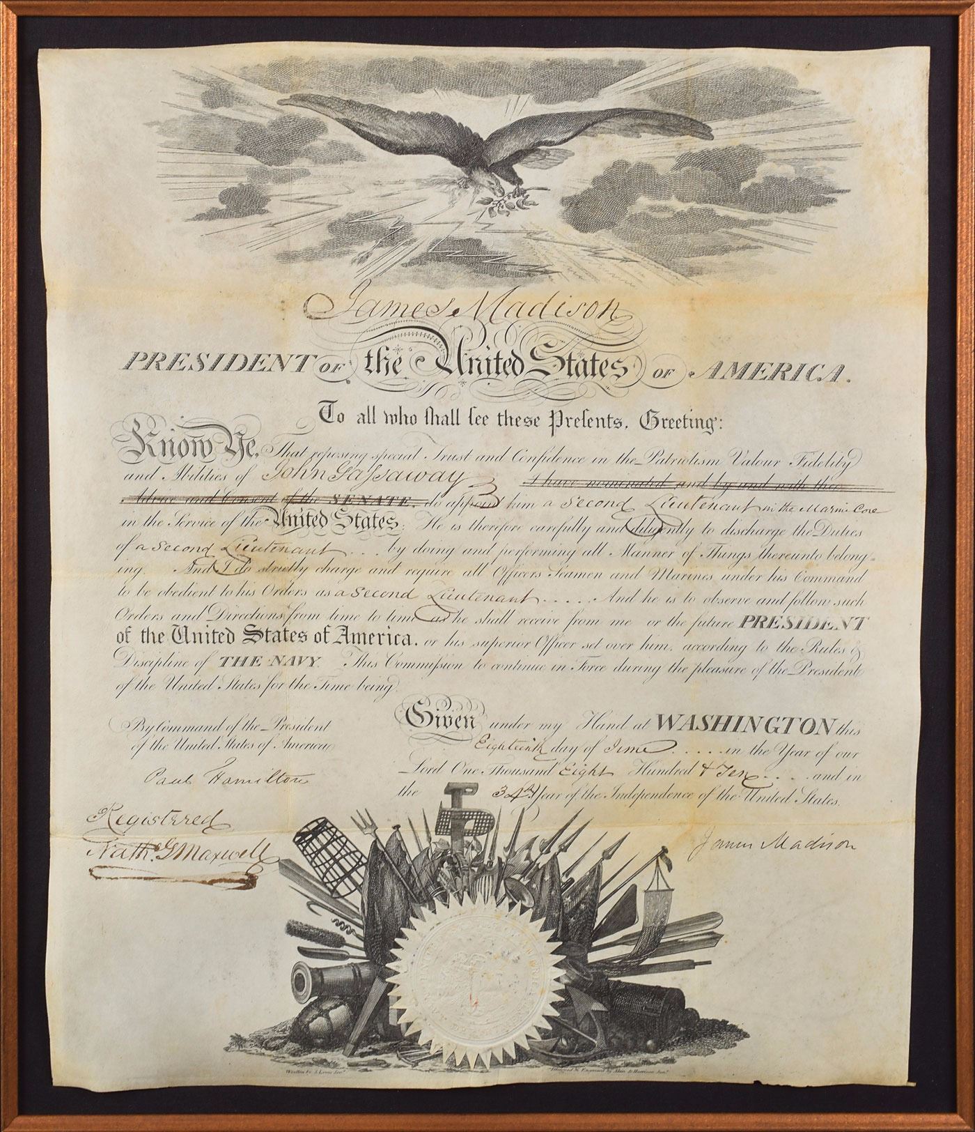 Partly-printed vellum DS as president, one page, 14.25 x 17.25, June 18, 1803. President Madison appoints John Gassaway as "a Second Lieutenant in the Marine Core in the Service of the United States." Neatly signed at the conclusion by Madison and countersigned by Secretary of the Navy Paul Hamilton. The crisply embossed Department of the Navy seal affixed at the bottom remains fully intact. Also includes a clipped signature, "James Madison," with "Department of State" penned in another hand (likely removed from a free frank). Impressively mounted, matted, and framed together with a portrait and plaque to an overall size of 32 x 25.5. In very good to fine condition, with an old tape stain to the irregularly clipped signature, and light toning along the document's intersecting folds.