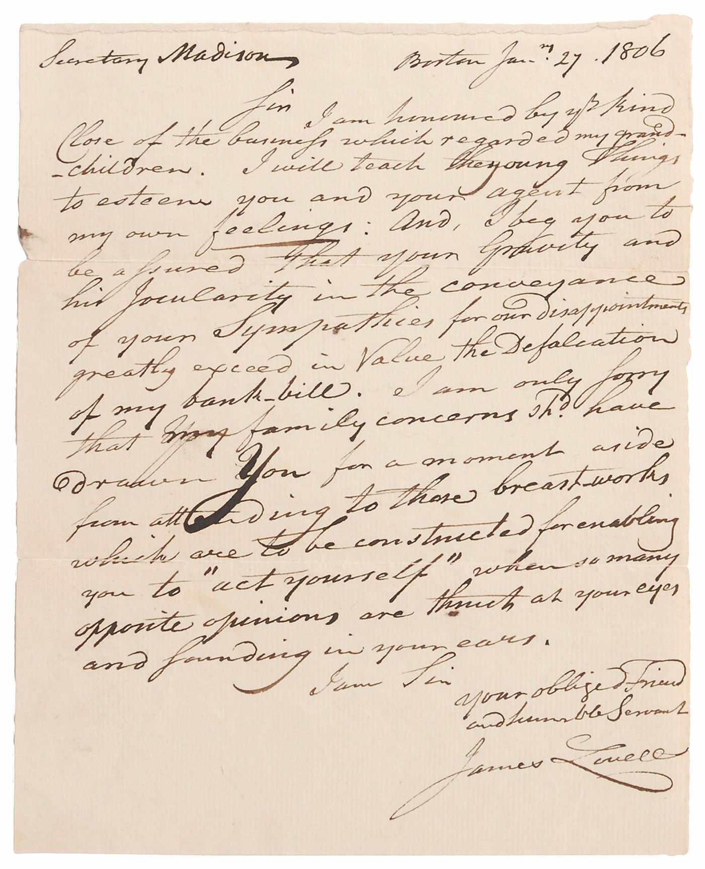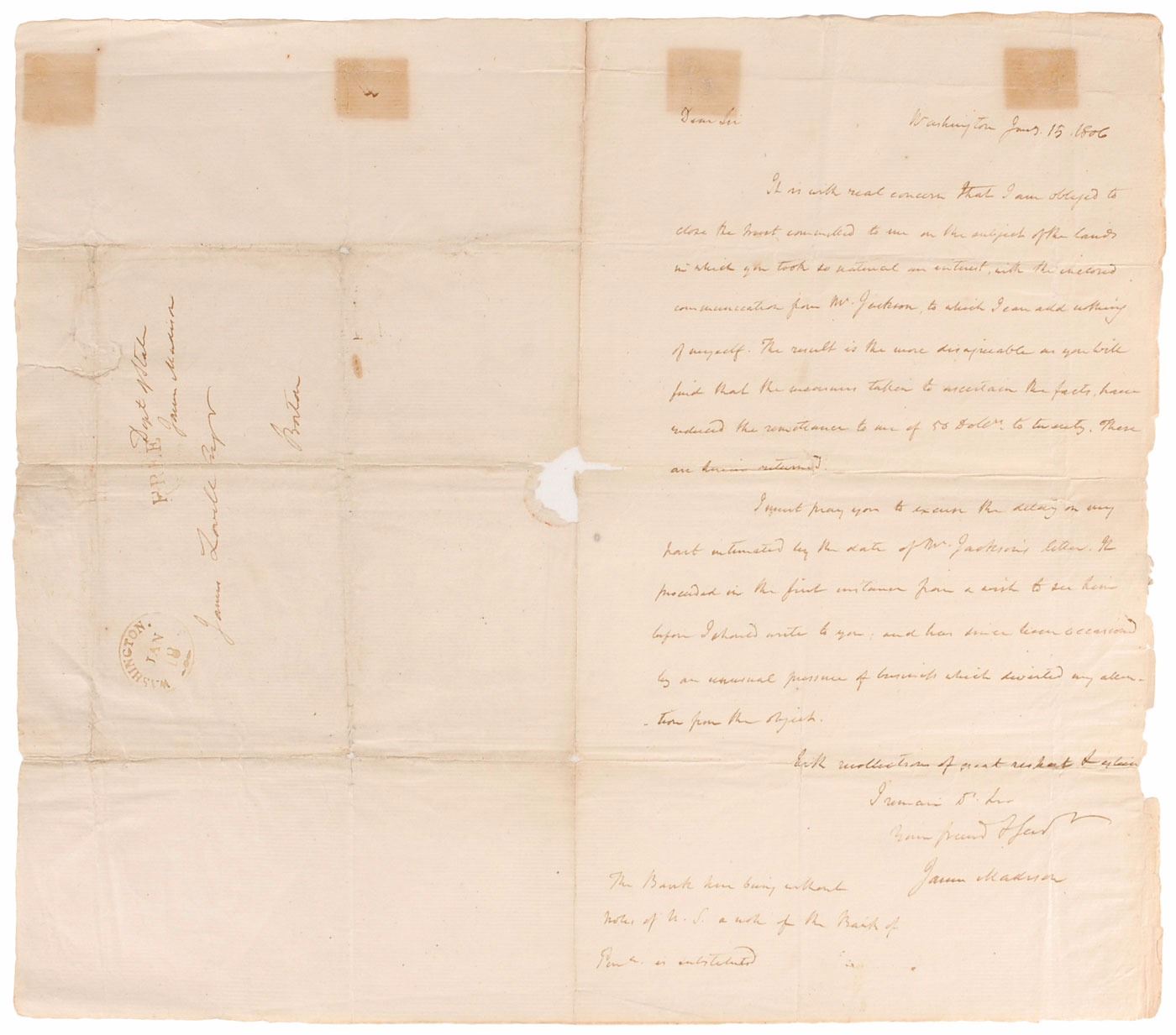 ALS, one page, 8 x 13, January 15, 1806. Letter to James Lovell in Boston, who was a member of the Continental Congress and signer of the Articles of Confederation. In part: “It is with real concern that I am obliged…on the subject of the lands in which you took so natural an interest, with the inclosed communication from Mr. Jackson, to which I can add nothing of myself. The result is the more disagreeable as you will find that the measures taken to ascertain the facts, have reduced the remittance to me of 50 Doll’rs to twenty.” Retains the integral address lead addressed in Madison’s hand and franked in the upper right, “Dept. of State, James Madison.” In very good to fine condition, with squares of discoloration along the top, and selective archival silking on the reverse to areas of paper loss and splits along folds. Accompanied by a letter from Lovell to Madison (apparently a retained copy of his response to this letter).
