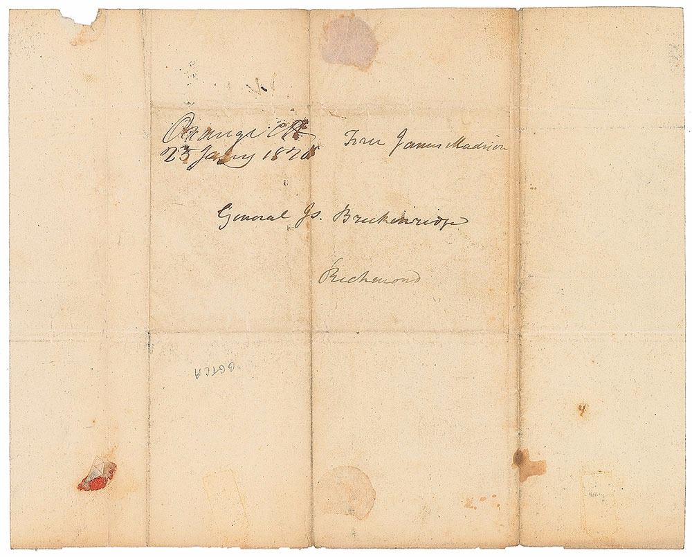 Full free frank, measuring 9.75 x 7.75 unfolded with a center panel of 5.25 x 3.25, addressed by Madison to "General Is. Breckinridge, Richmond," and franked, "Free, James Madison." Dated in the upper left by an unknown hand, "Orange CH., 25 Jany 182[6]." In very good to fine condition, with some creasing and toning. Accompanied by an engraving of Madison bearing a preprinted signature.