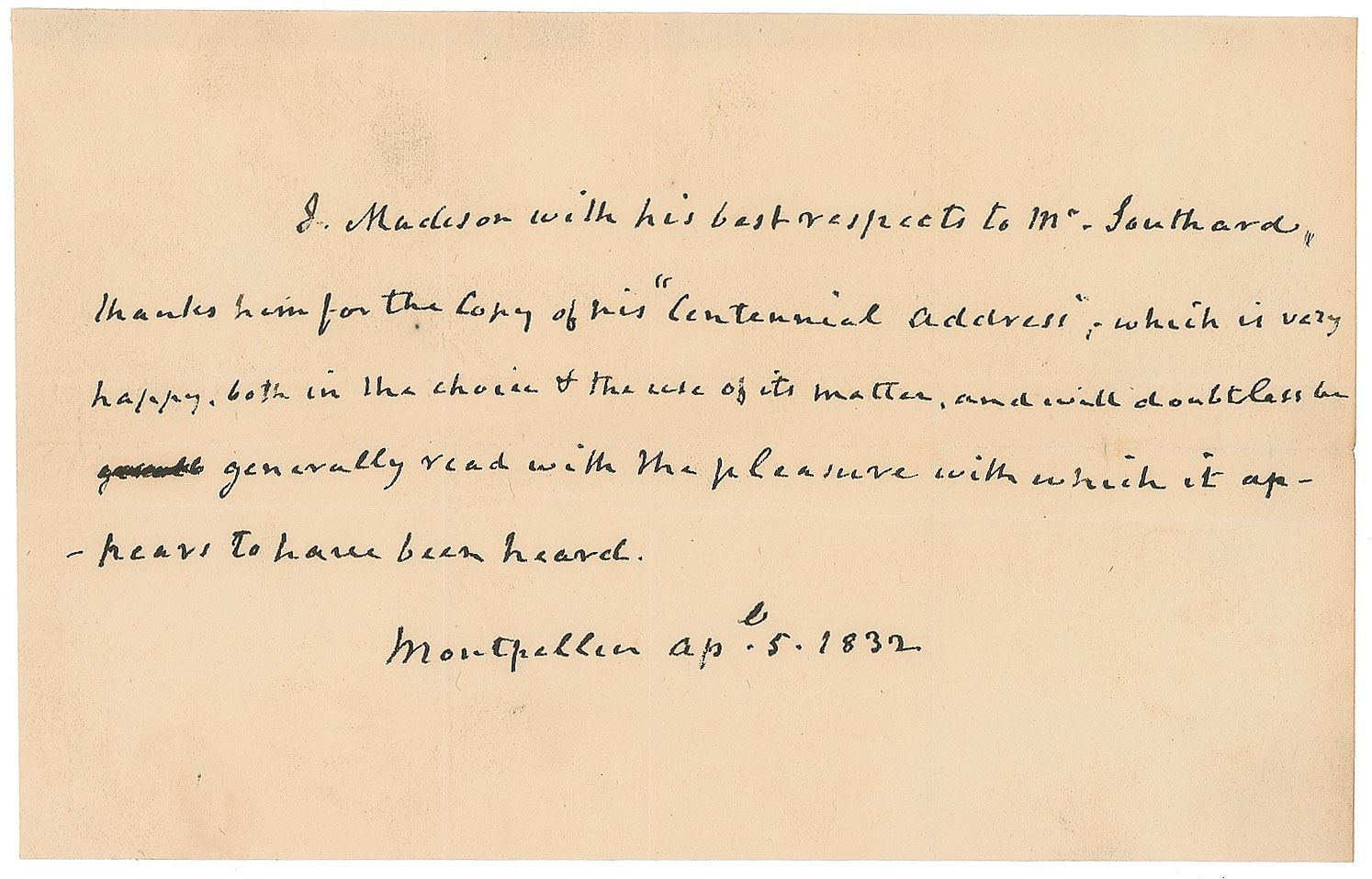 Third-person ALS signed “J. Madison,” one page, 7.5 x 4.75, April 5, 1832. In full: "J. Madison with his best respects to Mr. Southard, thanks him for the copy of his 'Centennial Address,' which is very happy, both in the choice & the case of its matter, and will doubtless be generally read with the pleasure with which it appears to have been heard." In fine condition. Samuel L. Southard, a prominent New Jersey statesman, had delivered an address in honor of the centenary of George Washington's birth on February 22, 1832, which was subsequently published.