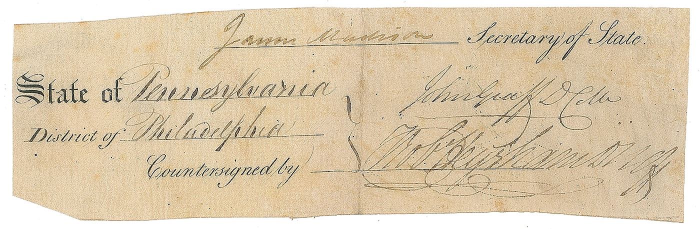 Ink signature as secretary of state, "James Madison,” on an off-white 6.75 x 2 vellum slip clipped from the close of a partly-printed document. In very good condition, with trimmed edges and light soiling.