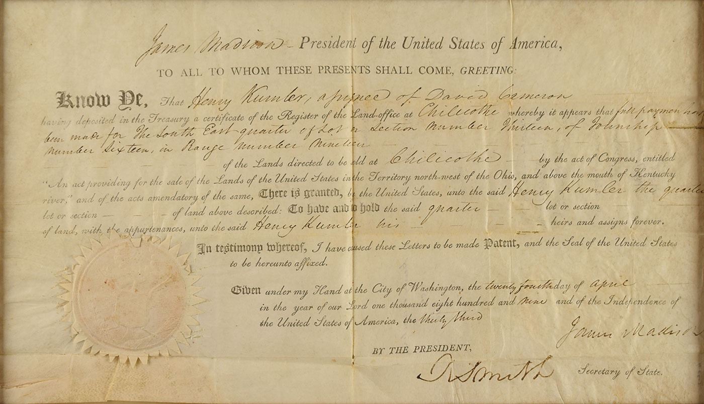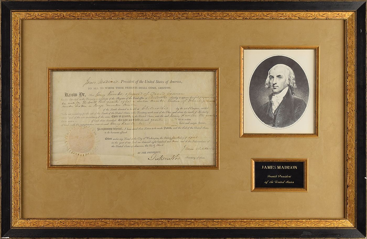 Partly-printed vellum DS as president, one page, 14.5 x 8.25, April 24, 1809. President Madison grants Henry Kumler a quarter lot of land in Chillicothe, Ohio. Signed at the conclusion by Madison, and countersigned by Secretary of State Robert Smith. Lower left retains the original white paper seal. Impressively matted and framed with a portrait and an engraved plaque to an overall size of 31.75 x 20.75. In very good to fine condition, with intersecting folds and light overall wrinkling. A decidedly early document from Madison, who had been inaugurated as the fourth American president less than two months prior.