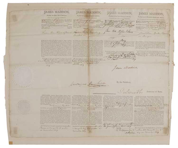 Partly-printed DS as president, one page, 20.5 x 16.5, November 4, 1809. Four language ship’s papers issued to “Benjamin C. Simmons, master and commander of the brig called The Regulator…lying present in the port of New York bound for Lisbon and laden with Flour-Pork-Pepper & Stores.” Nicely signed in ink by Madison and countersigned by Secretary of State Robert Smith. Document is affixed at the edges to a slightly larger board. Intersecting folds, scattered edge wear and creasing, and toning to corners and vertical fold from adhesive on reverse, otherwise fine condition. Both seals remain crisp and intact, and Madison’s signature is unaffected by any of the flaws. Pre-certified John Reznikoff/PSA/DNA and RRAuction COA.