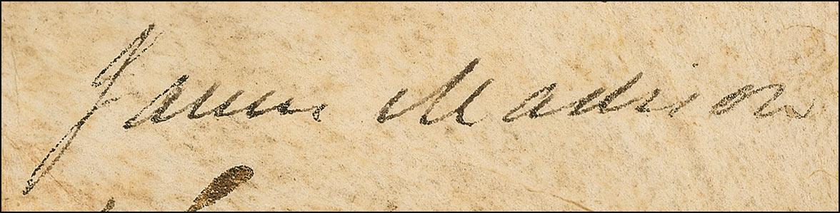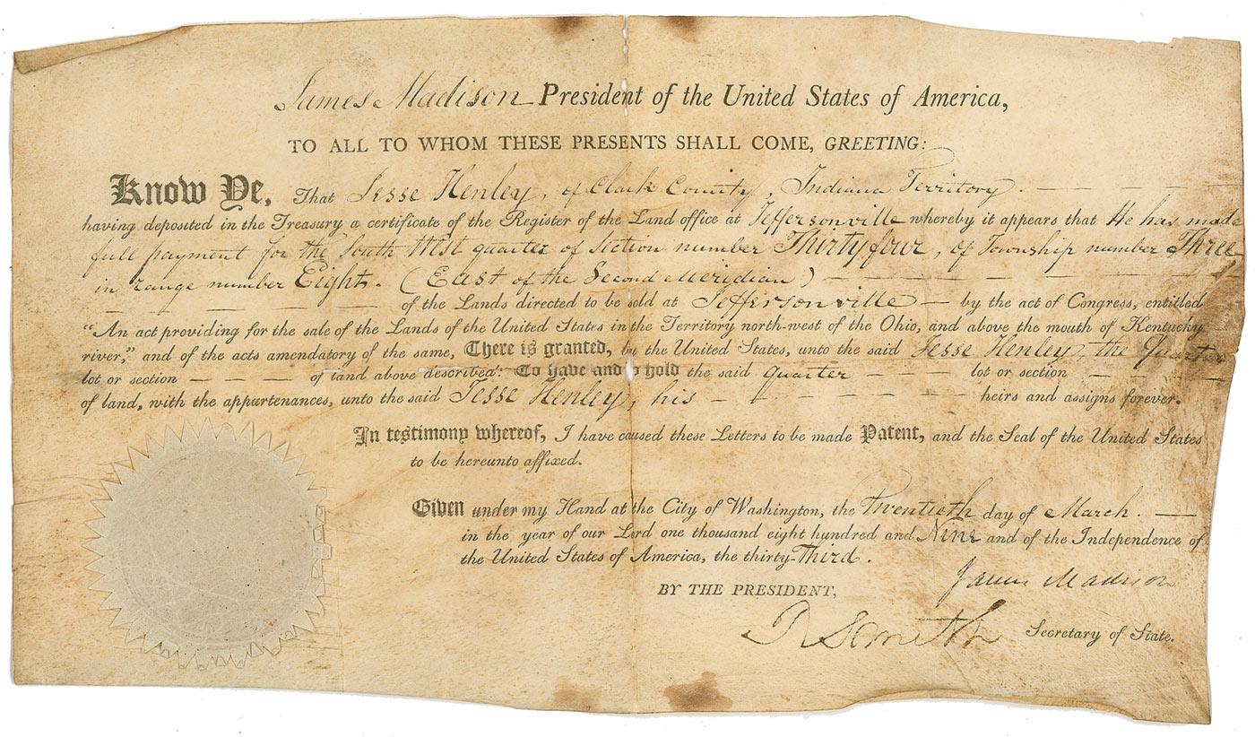 Partly-printed DS as president, one page, 14 x 8, March 20, 1809. President Madison signs a land grant for a tract of land in Jeffersonville for Jesse Hensley in the Indiana Territory. Signed at the conclusion in black ink by Madison and countersigned by Secretary of State Robert Smith. In good condition, with trimmed edges, small areas of paper loss along intersecting storage folds, and scattered toning and soiling. The white paper seal is worn, but intact. The city plans for Jeffersonville were laid out by Thomas Jefferson and it was the only such city that he ever designed. In 1802, future President William Henry Harrison, who was the Governor of the Indiana Territory at the time, decided to name the new city Jeffersonville in honor of Thomas Jefferson. Pre-certified John Reznikoff/PSA/DNA and RRAuction COA.