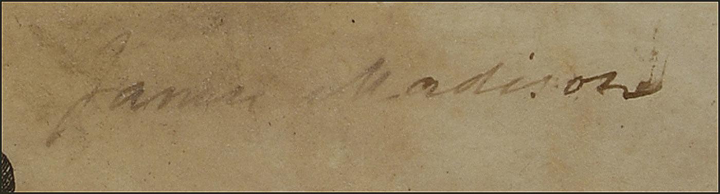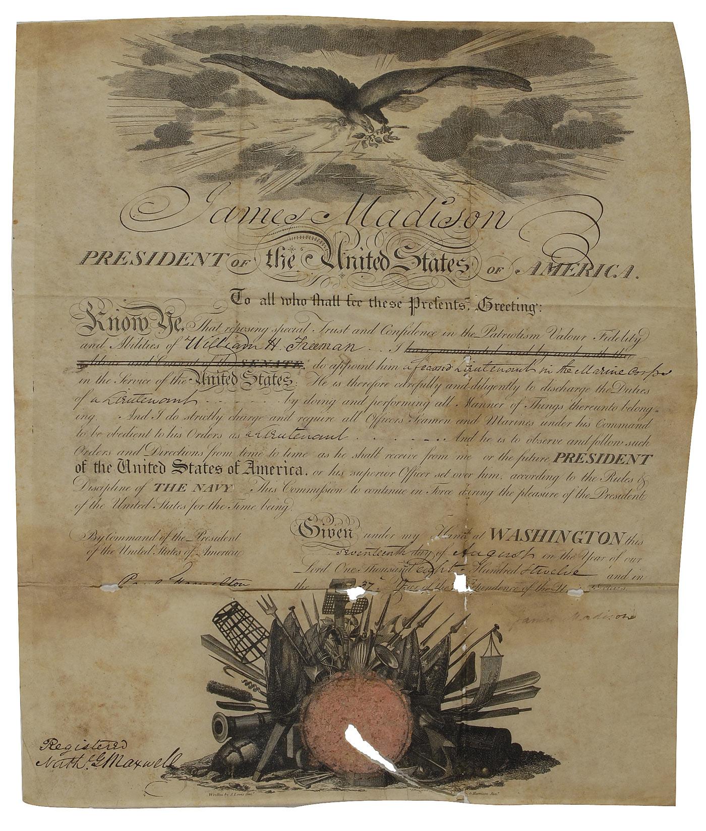 Uncommon partly-printed Marine DS as president, one page, 14.25 x 17, August 17, 1812. President Madison appoints William H. Freeman “a Second Lieutenant in the Marine Corp.” Signed at the bottom by Madison and countersigned by Secretary of the Navy Paul Hamilton. Moderate storage folds, toning and light fading to Madison’s signature, scattered paper loss along folds and at bottom, scattered toning and soiling, and red seal remnants to bottom, otherwise good condition. Marine-related documents are highly desirable. Pre-certified John Reznikoff/PSA/DNA and RRAuction COA.