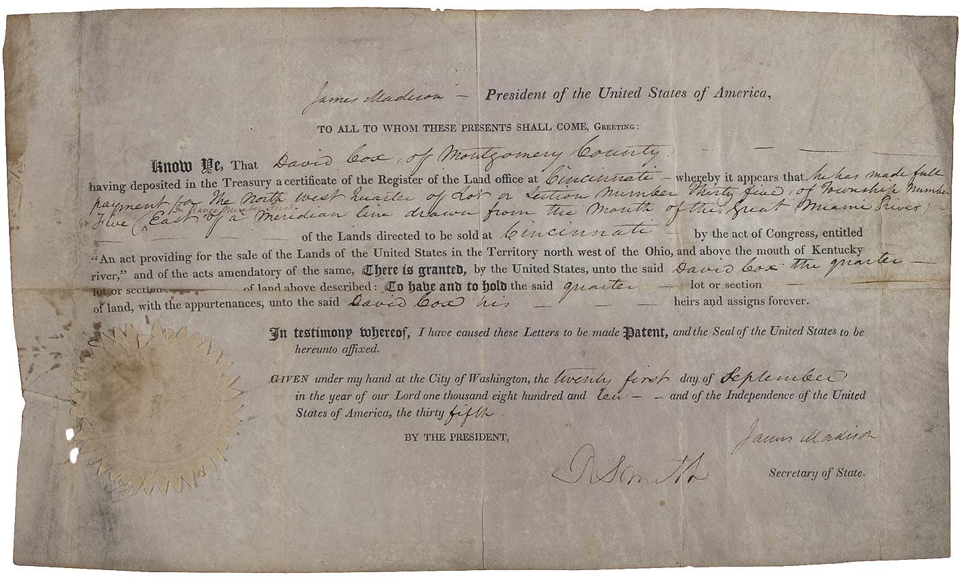 Partly-printed DS as president, one page, 15.5 x 9, September 21, 1810. Land grant issued to David Cox of Montgomery County for a tract of land in Ohio, under an “Act of Congress entitled ‘An Act providing for the sale of the Lands of the United States in the territory north-west of the Ohio and above the mouth of the Kentucky River.’” Signed at the conclusion by Madison, and countersigned by Secretary of State Robert Smith. Matted to an overall size of 20 x 13.5. In fine condition, with previous storage folds, scattered light toning and wrinkling, and some staining to left edge. The white paper seal is toned and worn, but intact.