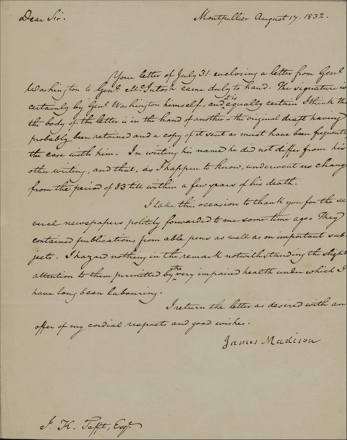 Philographically wonderful LS, one page, 7.5 x 9.5, August 17, 1832. Madison writes to Israel K. Tefft, Esquire, to verify the authenticity of George Washington’s signature on a letter. In full: “Your letter of July 31 enclosing a letter from Genl. Washington to Genl. McIntosh came duly to hand. The signature is certainly by Genl. Washington himself, and tis equally certain I think that the body of the letter is in the hand of another—the original draft having probably been retained and a copy of it sent as must have been frequently the case with him. In writing his name he did not differ from his other writing, and that, as I happen to know, underwent no change from the period of [17]83 till within a few years of his death.