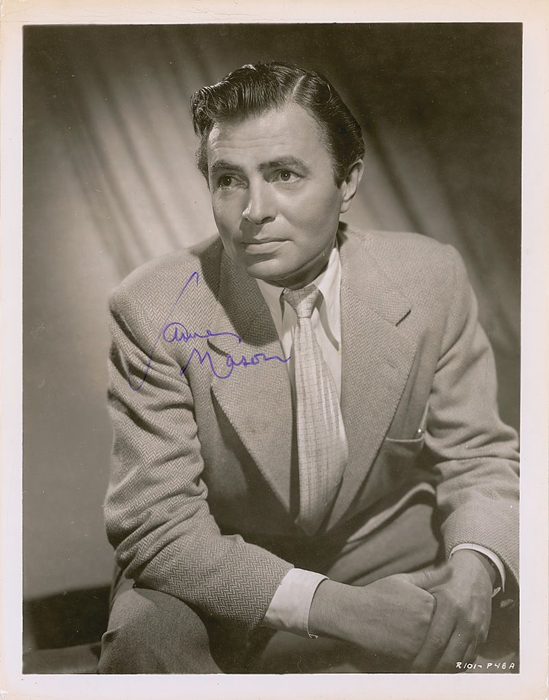 Glossy 8 x 10 publicity photo of a dashing Mason, signed in purple felt tip. Reverse has printed publicity information about Pandora and the Flying Dutchman, the “most discussed and provocative box office attraction in recent film history.” In fine condition, with light creases, trivial toning along top and bottom borders, and light show-through from printed caption.