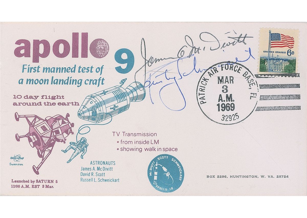 Commemorative cover with a cachet honoring Apollo 9, signed in black ballpoint by James McDivitt and blue ballpoint by Russell Schweickart. In fine condition.