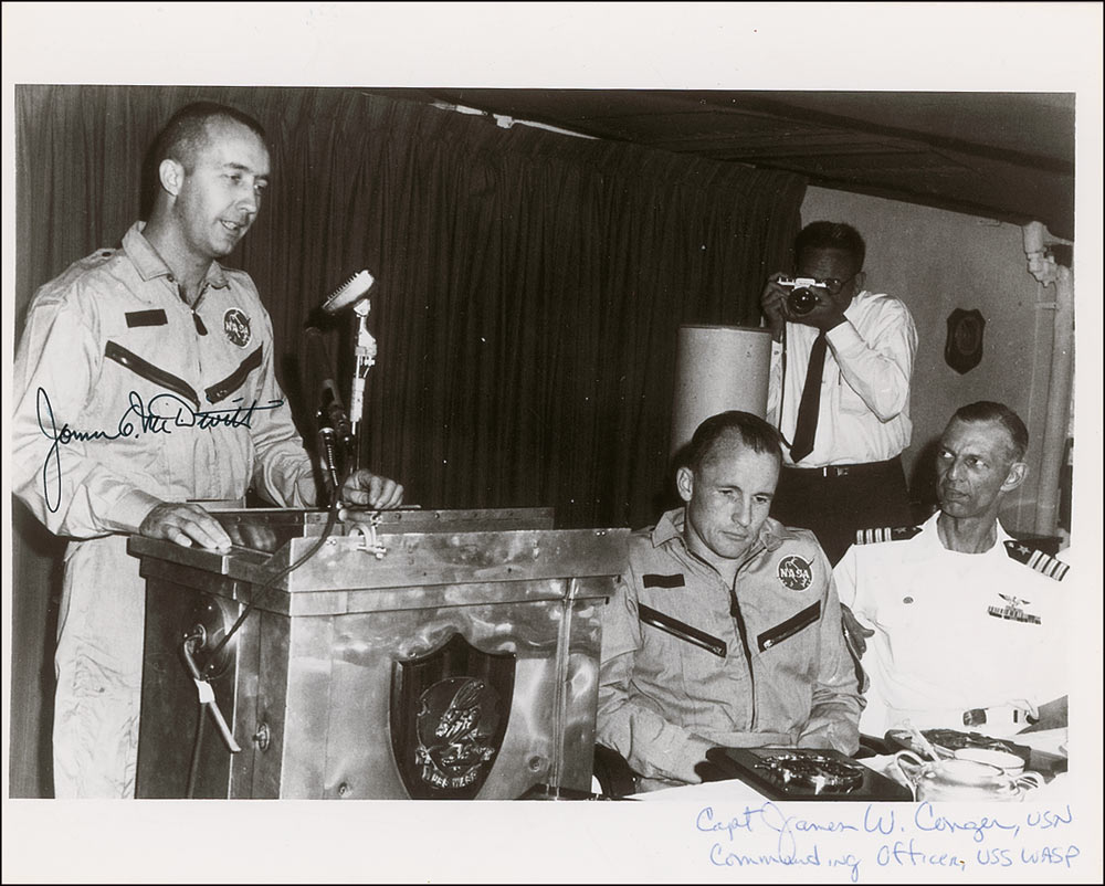 Satin-finish 10 x 8 photo, signed in black felt tip “James A. McDivitt.” Also signed in blue ballpoint by the commanding officer of the USS Wasp. In fine condition, with a couple of bends.
