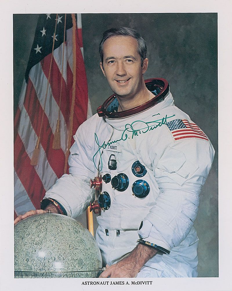 Color 8 x 10 NASA photo of McDivitt in his white space suit, signed in green felt tip, “James A. McDivitt.” In very fine condition.