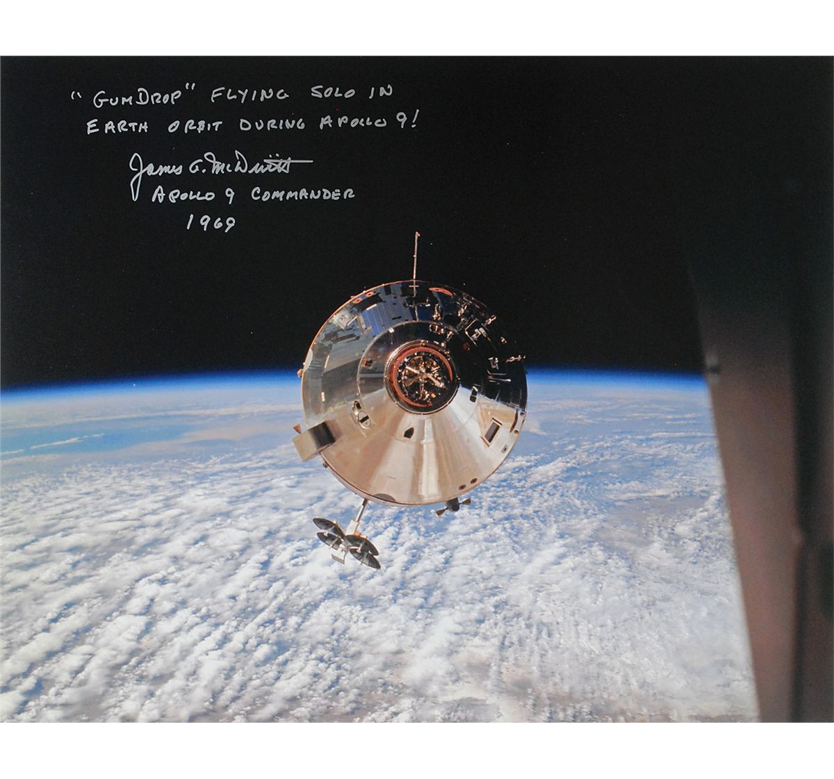 Breath-taking color satin-finish 20 x 16 photo of the Apollo 9 CSM in earth orbit, signed in silver ink, “‘Gumdrop’ flying solo in earth orbit during Apollo 9! James A. McDivitt, Apollo 9 Commander, 1969.” In very fine condition.