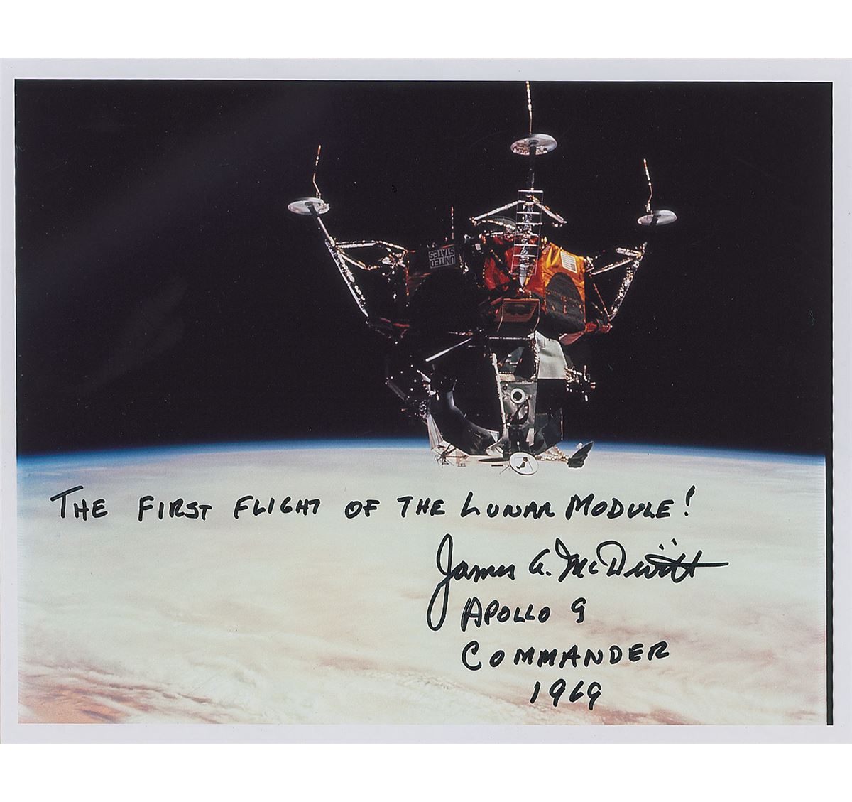 Color satin-finish 8 x 10 photo of the Apollo 9 lunar module in space, signed in black felt tip, “The first flight of the lunar module! James A McDivitt, Apollo 9, Commander, 1969.” In fine condition, with trivial surface impressions to upper right.