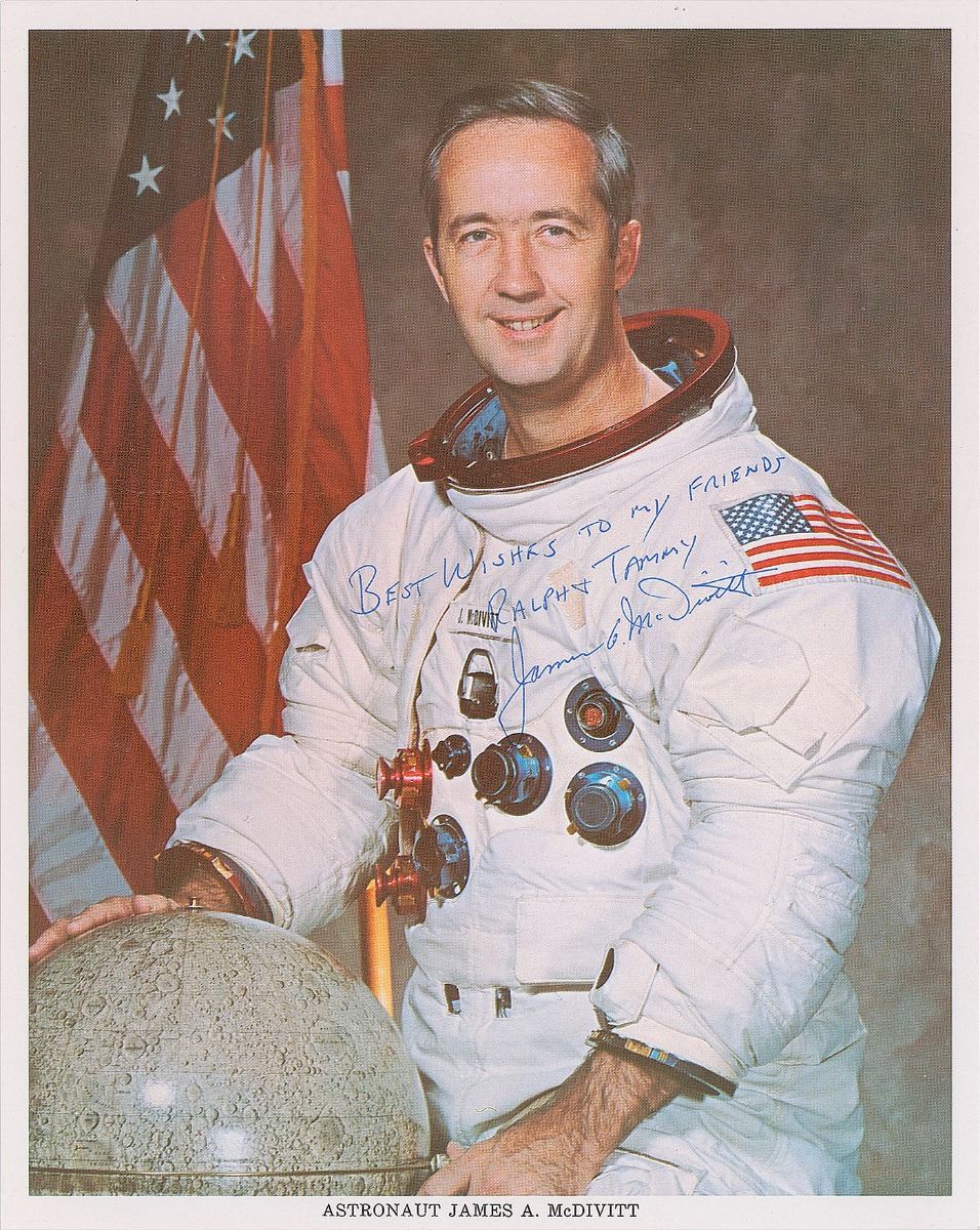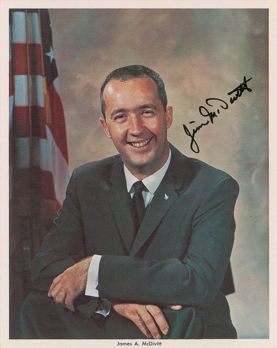 Two official color semi-glossy 8 x 10 NASA photos of the Apollo 9 CDR: one showing him wearing a suit and tie, signed in black felt tip, “Jim McDivitt”; and the other features McDivitt posing in his white space suit, signed and inscribed in blue ballpoint, “Best wishes to my friends, Ralph & Tammy, James A. McDivitt.” In overall very good to fine condition, with a horizontal crease to the WSS photo.