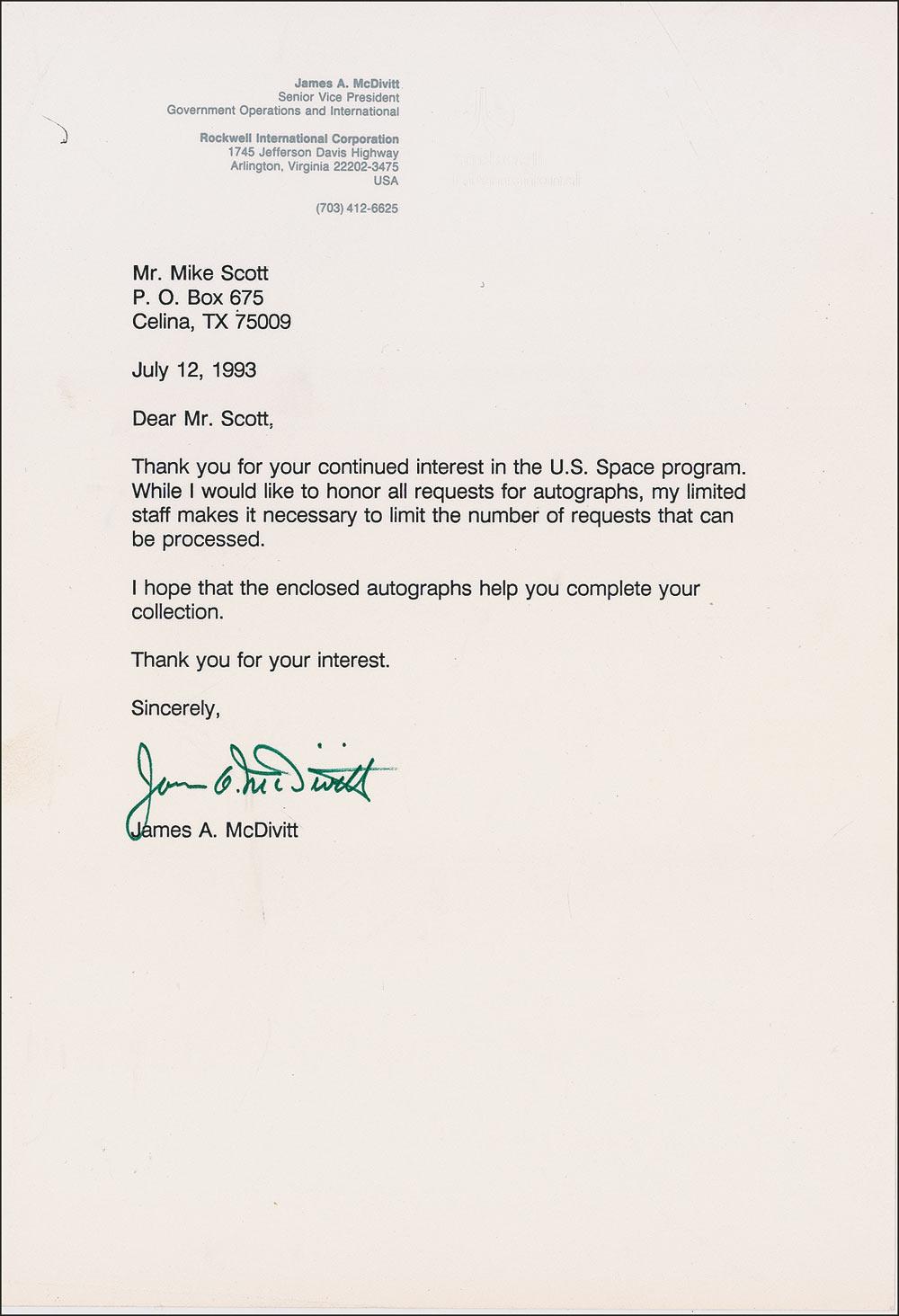 TLS signed “James A. McDivitt,” one page, 7.25 x 10.5, Rockwell International letterhead, July 12, 1993. Short letter to a collector. In part: “Thank you for your continued interest in the U. S. Space program. While I would like to honor all requests for autographs, my limited staff makes it necessary to limit the number of requests that can be processed.” In fine condition. Pre-certified Scott Cornish and RRAuction COA.