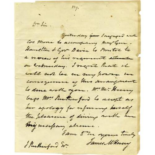 <B>James McHenry Autograph Letter Signed</B></I> "<I>James McHenry,</B></I>" one page, 7.75" x 9.5". No place, no date. Integral leaf addressed by McHenry to "<I>J Rutherford Esq.</B></I>" In full, "<I>Yesterday I engaged with Col. Moore to accompany Majr Gen Hamilton & Govr Davis to Bristol to a review of his regiment on Wednesday. I regret that it will not be in my power in consequence of this arrangement to dine with you. Mrs. McHenry begs Mrs Rutherford to accept as her apology for refusing herself the pleasure of dining with her my necessary absence.</B></I>" James McHenry a surgeon in the Fifth Pennsylvania Battalion in the American Revolution, later served as secretary to General Washington (1778-1780) and on the staff of General Lafayette (1780-1781). A signer of the Constitution, he represented Maryland in the Continental Congress (1783-1785) and was Washington and Adams' Secretary of War from 1796-1800. Fort McHenry in Baltimore harbor is named in his honor. Mounted on a card, the letter is in fine condition.<BR><BR><b>Shipping:</b> Flat Material, Small (<a target="_blank" href="http://www.heritageauctions.com/common/shipping.php">view shipping information</a>)