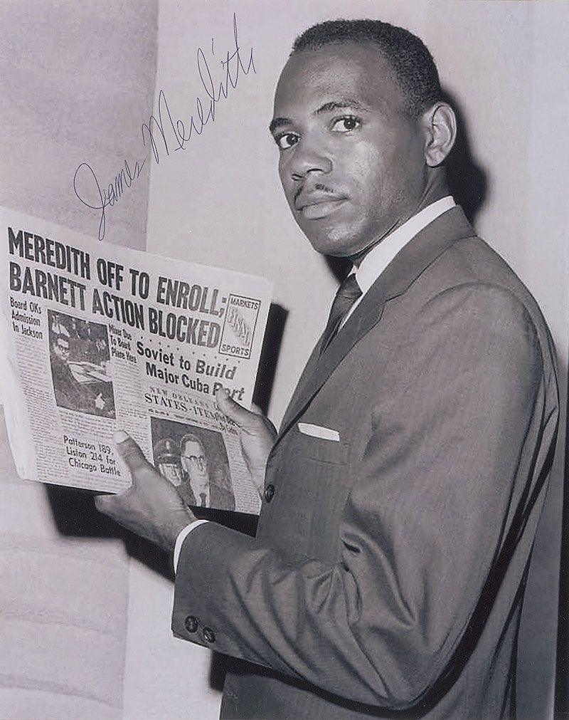 Civil rights icon (born 1933) who gained worldwide attention in 1962 when, after a public political struggle between JFK and segreationist Governor Ross Barnett, he became the first black student admitted to the University of Mississippi. Satin-finish 8 x 10 photo of Meredith holding a newspaper announcing his college enrollment, signed in black felt tip. In very fine condition.