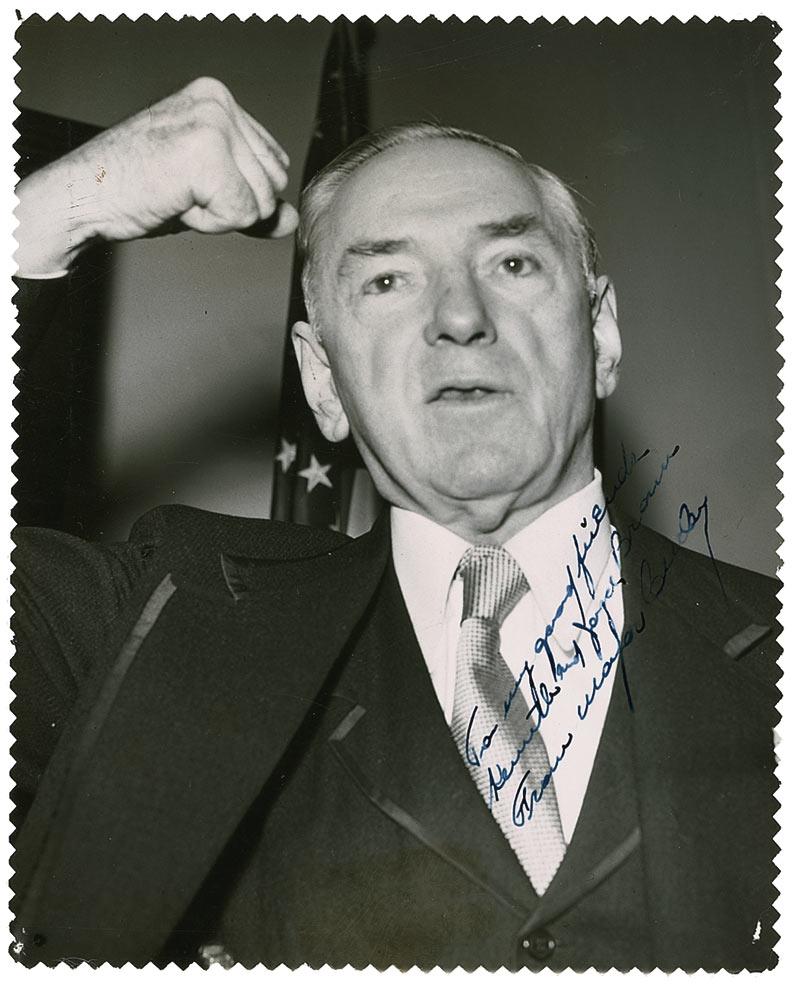 Corrupt but popular longtime congressman, mayor of Boston, and Governor of Massachusetts. Vintage glossy 6.5 x 8.25 deckle-edge photo, signed and inscribed in blue ink “For my good friends Kenneth and Joyce Browne from Mayor Curley.” In very good condition, with scattered creases, surface marks, and crazing to finish. RRAuction COA.