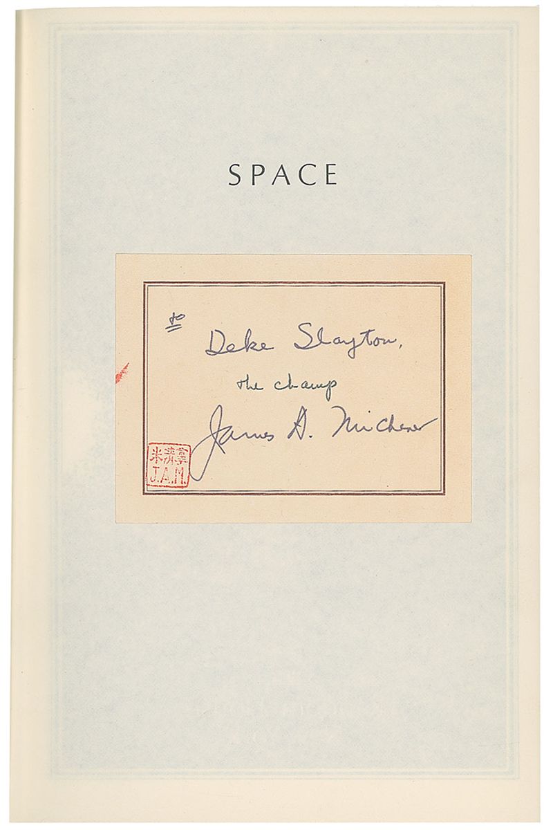 Signed book: Space. First edition, later printing. NY: Random House, 1982. Hardcover with dustjacket, 6.5 x 9.5, 622 pages. Signed and inscribed on a bookplate affixed to the first free end page “To Deke Slayton, The Champ, James Michener.” In very good c