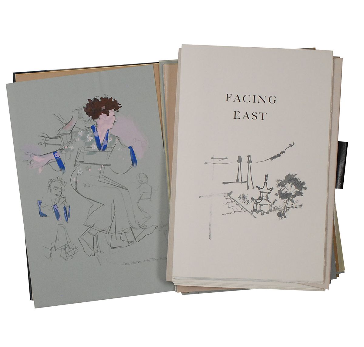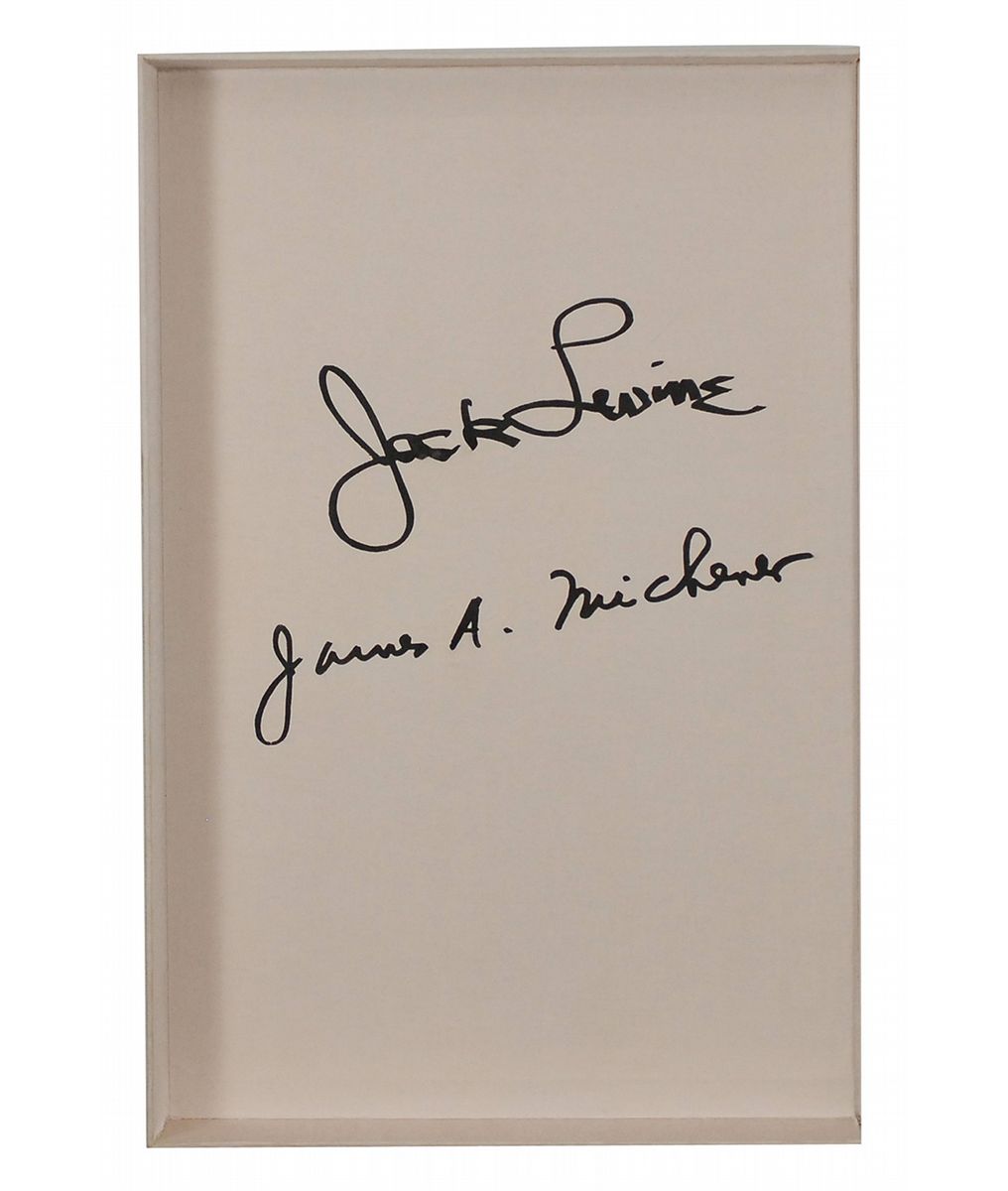 Limited edition portfolio entitled Facing East featuring text by James Michener and art by Jack Levine. Limited edition, numbered 916/2500. NY: Maecenas Press, 1970. Hardcover with cloth clamshell case, 13 x 19. Signed on the colophon by Michener and Jack Levine. Also includes a black leather folder containing prints of Levine’s sketchbook printed by phototype and pochoir processes on Ingres paper. In fine condition.