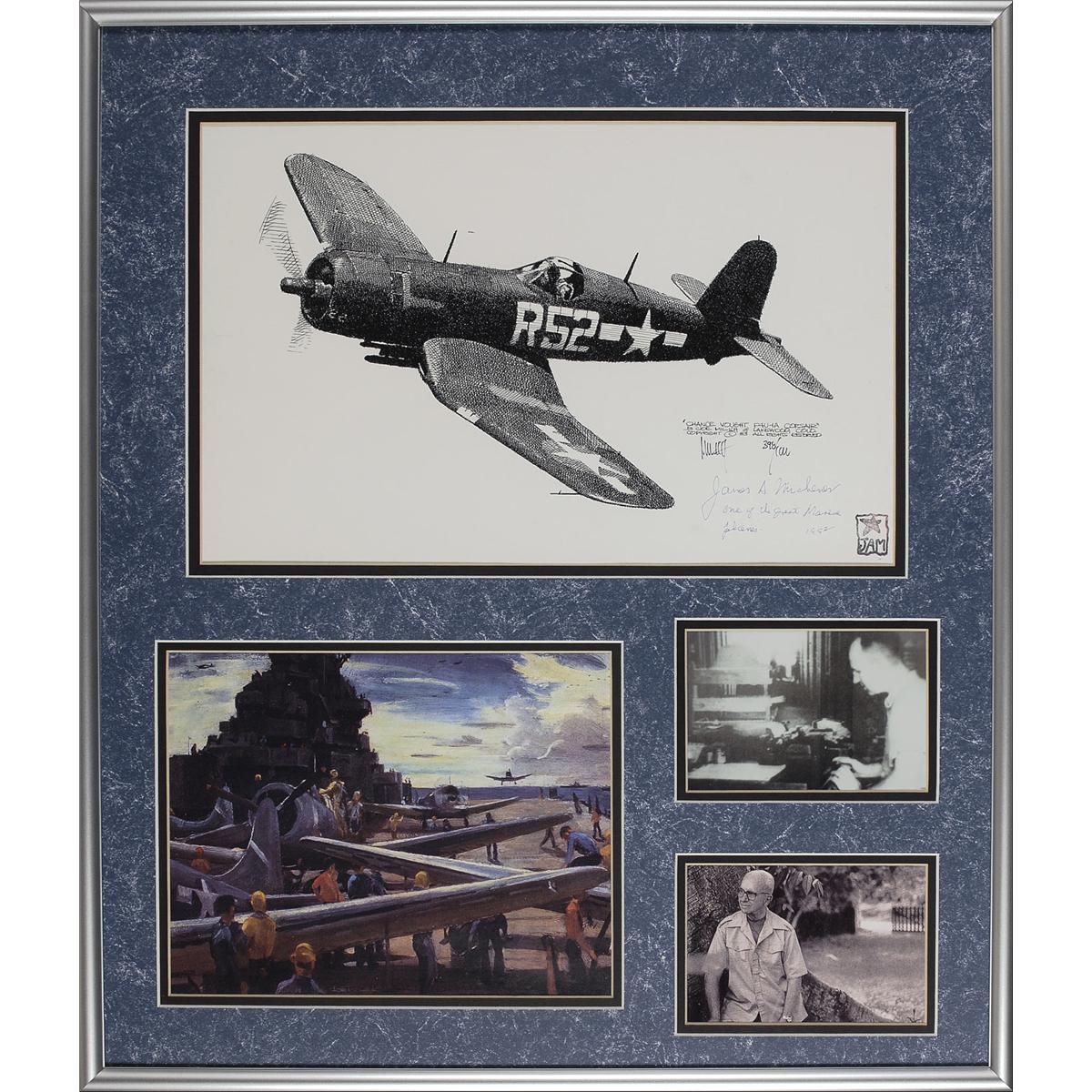 Limited edition 17 x 11 print of a Chance Vought F4U-1A Corsair, numbered #398/1000, signed in blue ballpoint, “James A. Michener, one of the great Marine planes 1992.” Double matted and framed with three photos, to an overall size of 22 x 25.5. Also signed in pencil by the artist Joe Milich. In very fine condition. Oversized. Michener was a WWII Naval officer in the Pacific Theatre.
