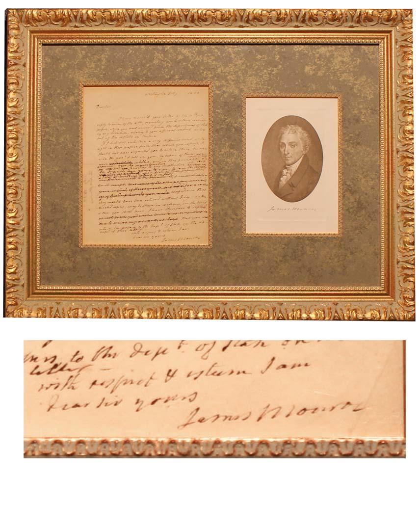 James Monroe autograph letter signed and dated, ''Washington July 1823'' with no specific day. Letter reads in part, ''…if i did not entertain a very different view of the night in those papers…I should not have requested you to return them…'' Long, handwritten letter, measuring 7.5'' x 9.5'', has portions of cursive crossed out and written over by Monroe. Gilt frame with olive green marble-textured mat measures 24.75'' x 18.5''. Toning and light show-through from writing on verso, otherwise near fine. Also includes portrait engraving.