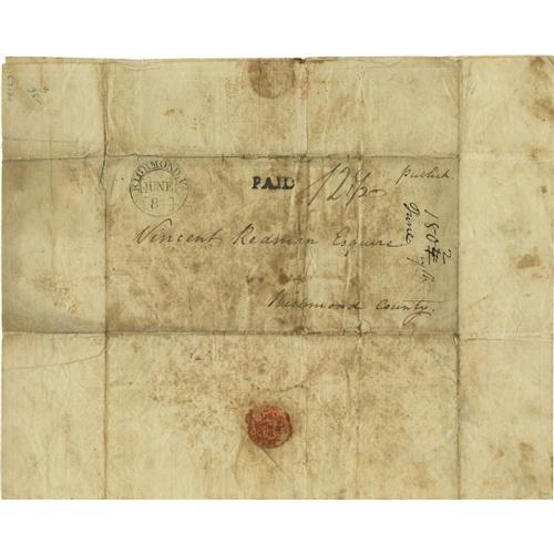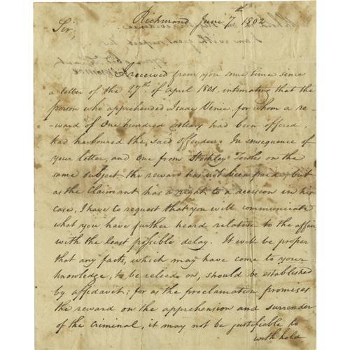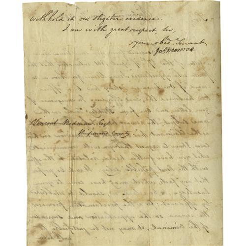 <B>James Monroe Autograph Letter Signed.</B></I> Written at "<I>Richmond June 7th, 1802.</B></I>" Measures 7.75" x 9.5", Two sides, plus integral exterior sheet with address and frank. Very good, due to scattered foxing. A legal communication, presumable to a fellow attorney, one Vincent Redman, Esq. Monroe represented a plaintiff who had been denied a reward of $100 for the apprehension of a fugitive, or the grounds that the claimant had in fact "<I>harbored the said offender</B></I>." From the Henry E. Luhrs Collection. Accompanied by LOA from PSA/DNA.