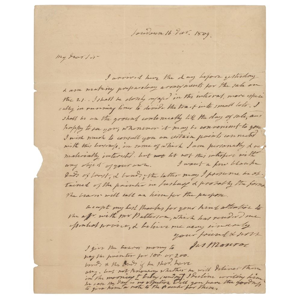 ALS signed "Jas. Monroe," one page, 8 x 10, December 16, 1809. Handwritten letter to Charles F. Mercer, in part: "I arrived here the day before yesterday & am making preparatory arrangements for the sale on the 21. I shall be closely engaged in the interval, more specially in running lines to divide the tract into small lots. I shall be on the grounds continually till the day of sale, and happy to see you, whenever it may be convenient to you. I wish much to consult you on certain points connected with this business, in some of which I am personally & very materially interested, but let not this interfere with any object of your own…Accept my best thanks for your kind attention to the offer with Mr. Patterson." Monroe adds a lengthy postscript below. In very good to fine condition, with short edge tears, and seal-related paper loss to the left edge and integral address leaf. Charles Fenton Mercer was a Virginian lawyer and politician (1778–1858) who served a U.S. Congressman from 1817 to 1839.