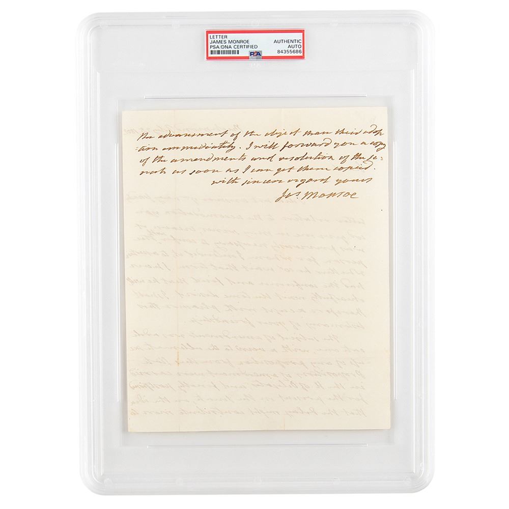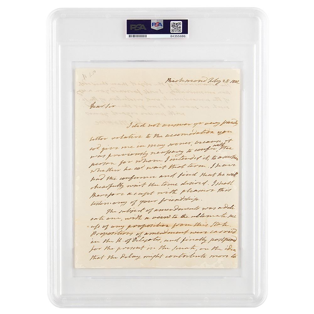 ALS signed "Jas. Monroe," one page both sides, 7 x 9, Richmond, July 28, 1802. Handwritten letter to an unidentified gentleman, in full: "I did not answer yr very friendly letter relative to the accommodation you w'd give me in May sooner, because it was previously necessary to confer with the person for whom I intended it, to ascertain whether he co'd wait that term. I have had the conference and find that he will cheerfully wait the time desired. I shall therefore accept with pleasure this testimony of your friendship. The subject of amendments was a delicate one, with a view to the ultimate success of any proposition from this State. Propositions of amendment were carried in the H. of Delegates, and finally postponed for present in the Senate, on the idea that the delay might contribute more to the advancement of the object that their adoption immediately. I will forward you a copy of the amendments as soon as I can get them copied." In fine condition. Encapsulated in a PSA/DNA authentication holder.