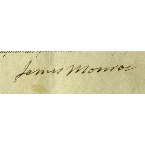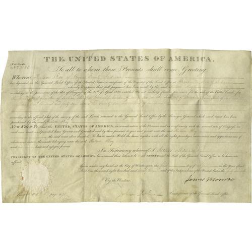 <B> President James Monroe Document Signed,</B></I> "<I> James Monroe</B></I>". Partially printed vellum land grant, one page, 15.5" x 9.5", Washington, D.C., April 1, 1823. This document transfers one hundred and forty one acres of public lands to Hutson Ray of Wayne County, Indiana. Large, bold presidential signature. Folds, soiling and fading. Very Good condition. <BR><BR><B>Impo