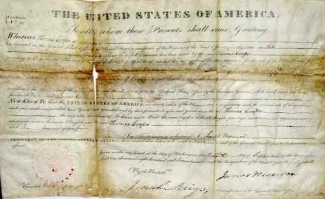 James Monroe signed land grant, as President, appointing a portion of land in Ohio to Thomas Cooper. Dated 12 September 1821, in Monroe's second term as President which he won virtually unopposed. Document measures approximately 16'' x 10'', housed in a 17.75'' x 12.5'' walnut frame. Overall in fair condition with wrinkling, toning and separation along one vertical fold. Seal to lower left corner remains intact.