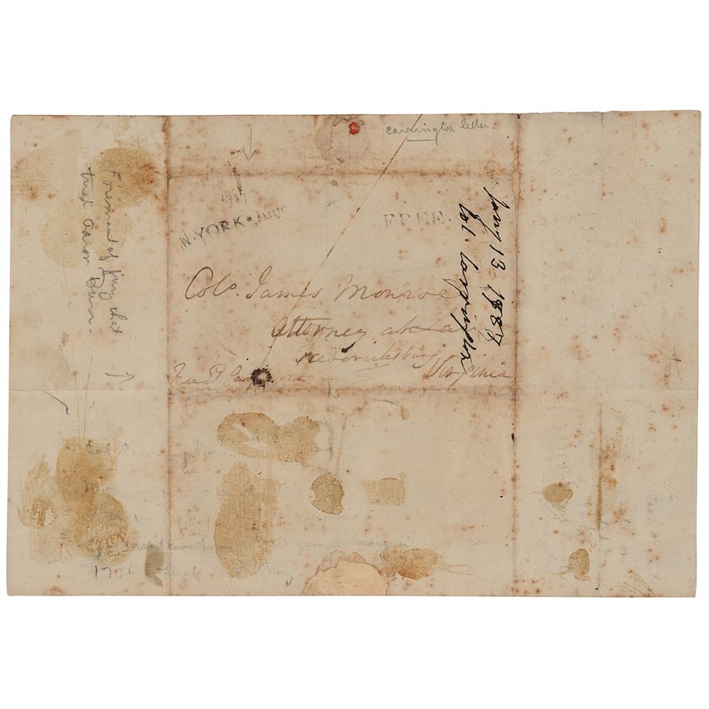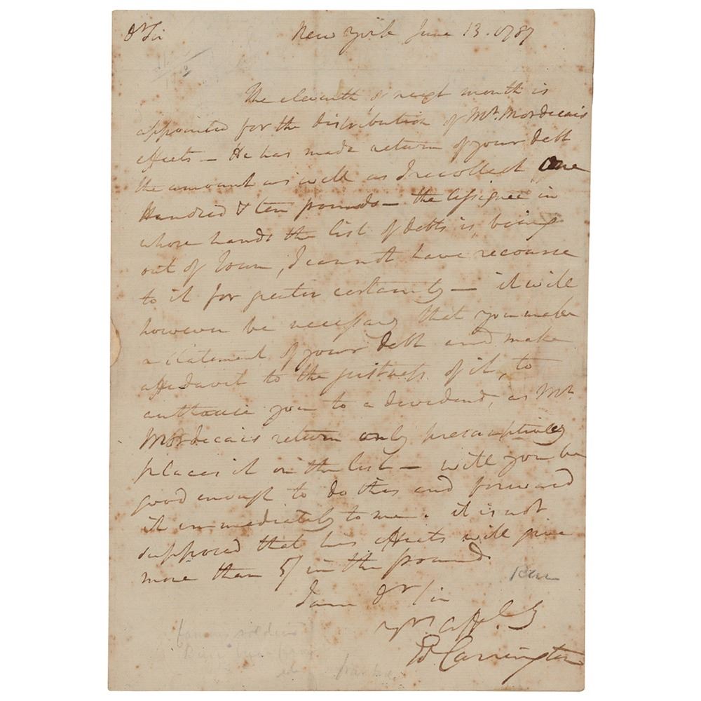 ALS signed "Ed. Carrington," one page, 7.25 x 10.5, June 13, 1787. Edward Carrington, a soldier and statesman from Virginia, writes to "Col. James Monroe, Attorney" to inform him of the repayment of a debt owed by the bankrupt Jacob Mordecai, a noteworthy American-born Jewish businessman and partner of financier Haym Salomon. Carrington writes, in part: "The eleventh of next month is appointed for the distribution of Mr. Mordecai’s effects. He has made return of your debt, the amount as well as I recollect one hundred & ten pounds. The assignee in whose hands the list of debts is being out of Town, I cannot have recourse to it for greater certainty—it will however be necessary that you make allotment of your debt and make affidavit for the justness of it, to [entitle] you to a dividend, as Mr. Mordecai’s return only presumptively places it on the list. Will you be good enough to do this and forward it immediately to me?" Addressed on the integral leaf to Monroe by Carrington, and franked "Free, Ed. Carrington" at the bottom; docketed in Monroe's hand, "June 13, 1787, Col. Carrington." In very good condition, with overall foxing, and adhesive residue stains to the integral address leaf, which also display a repair to seal-related paper loss.