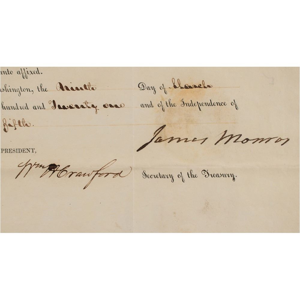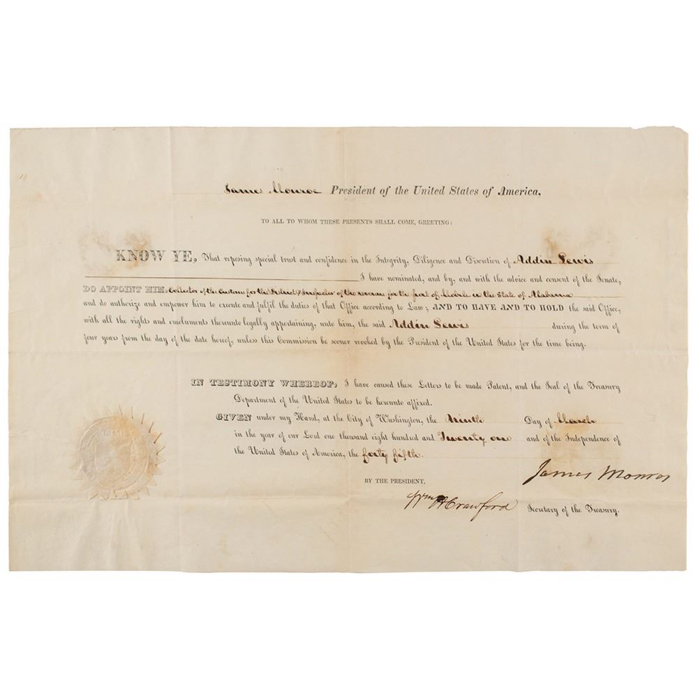 Partly-printed DS as president, one page, 15.75 x 10, March 9, 1821. President Monroe appoints Addin Lewis as "Collector of the Customs for the District & Inspector of the Revenue for the port of Mobile in the State of Alabama." Boldly signed at the conclusion by President Monroe and countersigned by Secretary of the Treasury William H. Crawford. In very good to fine condition, with scattered light staining and toning.
