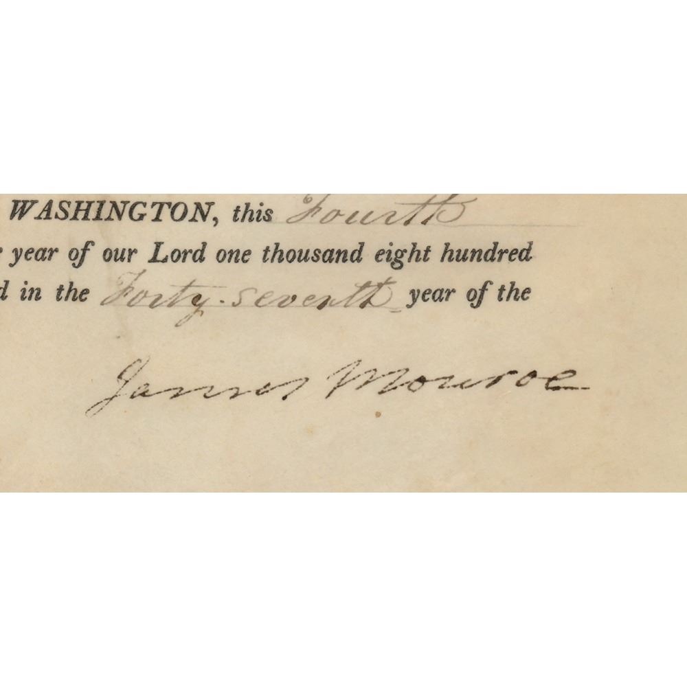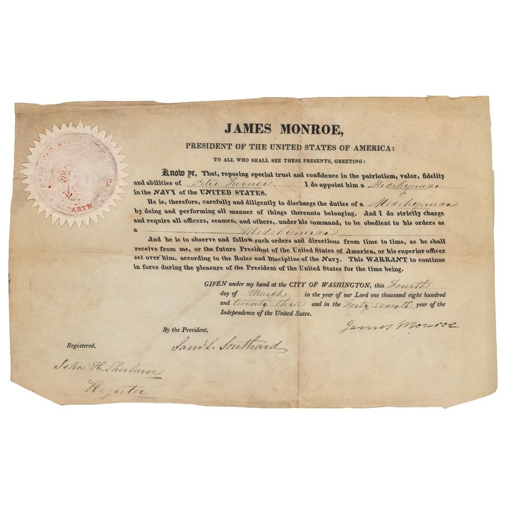 Partly-printed DS as president, one page, 13 x 8.5, March 4, 1823. President Monroe appoints Peter Turner as "a Midshipman in the Navy of the United States." Signed crisply at the conclusion by President Monroe, and countersigned by Secretary of the Navy Samuel Southard. The embossed white paper seal affixed to the upper left remains fully intact. In very good to fine condition, with light toning and staining, and clipped lower corner tips. Peter Turner (1803-71) spent his entire career in the U.S. Navy serving in both the Mexican and Civil Wars. He became a Commodore in 1863. This was the first U.S. Navy Commission issued to the future Commodore.