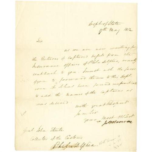 <B>James Monroe as Secretary of State Letter Signed,</B></I> one page, 7.75" x 9.5", Washington, D.C., May 7, 1812, to General John Steele, Philadelphia, Pennsylvania. The future president writes: "<I>As we are waiting for the Returns of Captured vessels from the Insurance offices of Philadelphia recently sent back to you, I must ask the favor of you to forward them to this Dept - even if it has been found impracticable to add the names of the captains as desired.</B></I>" Light toning, one small split on fold. Very good condition.<BR>An excellent early War of 1812 letter touching upon the maritime issues that in large part fueled the conflict. <I>Ex. Henry E. Luhrs Collection.</B></I><BR><BR><BR><b>Shipping:</b> Flat Material, Small (<a target="_blank" href="http://www.heritageauctions.com/common/shipping.php">view shipping information</a>)