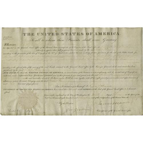 <B>James Monroe Document Signed,</B></I> "<I>James Monroe</B></I>". One page, partially printed vellum land grant, 15.25" x 9.5", Washington D.C., February 10, 1824. This grant awards 235 acres in "<I>Detroit, Territory of Michigan</B></I>" to Robert Flemming of New York. The inscriptions are somewhat faded, however Monroe's signature is large and quite legible. Fine condition.