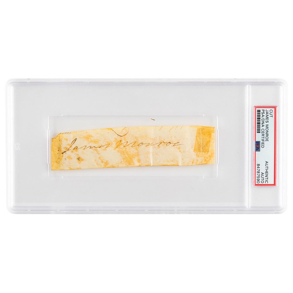 Ink signature, "James Monroe,& rdquo; on an off-white 5.5 x 1.25 slip clipped from a vellum document. In very good condition, with overall staining, including two tape stains to the sides. Encapsulated in a PSA/DNA authentication holder.