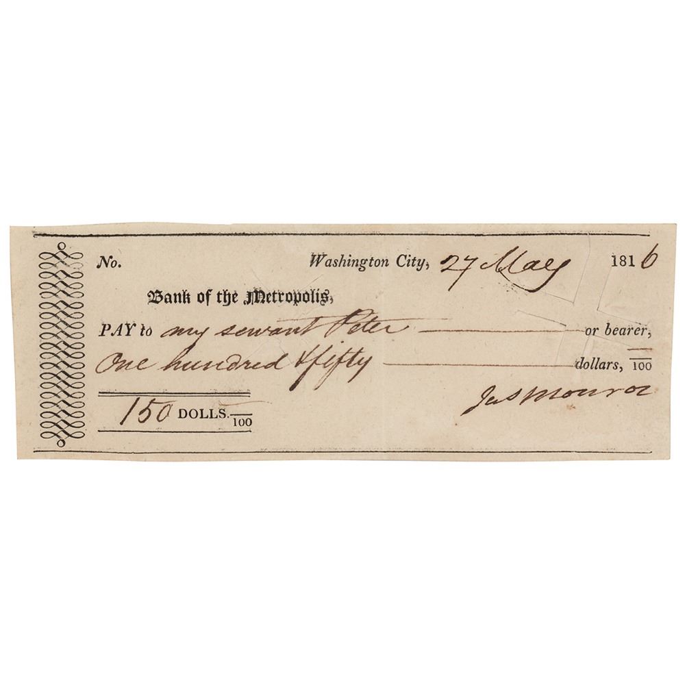 Rare Bank of the Metropolis check, 6.25 x 2.25, filled out and signed by Monroe, "Jas. Monroe," payable to "my servant Peter" for $150, May 27, 1816. In fine condition.